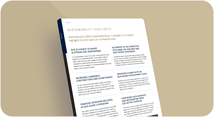 S U S T A I N A B I L I T Y H I G H L I G H T S Franco-Nevada’s 2025 Sustainability Report is available on our website. Highlights from the report are summarized below. DUE DILIGENCE TO INVEST IN STRONG ESG PERFORMERS Our key ESG-related areas of focus when making investments are detailed in our Sustainability Report. These include health and safety, carbon footprint, water management and risk, tailings management, and biodiversity. We have also evaluated the performance of the operators of our top revenue-generating mining assets in each of these five areas. INCREASED COMMUNITY CONTRIBUTIONS AND COMMITMENTS Our community contributions continue to grow year-over-year, including renewed funding for initiatives in Peru, Brazil and Senegal, as well as contributions to new initiatives in the United States and Canada. We remain committed to supporting mining industry groups and diversity initiatives. FINANCED EMISSIONS INCLUDED IN OUR SCOPE 3 EMISSIONS Since 2022, we have measured and disclosed financed GHG emissions attributable to our royalty and stream interests, included as Scope 3, Category 15 (Investments) emissions. Additionally, we provide a high-level guide to understanding the Greenhouse Gas Protocol standards, detailing the components that comprise Scope 1, 2 and 3 emissions. MAINTAINED CARBON NEUTRALITY FOR CORPORATE EMISSIONS Since 2020, we have maintained carbon neutrality for our corporate operations. We have accomplished through the purchase of high quality carbon credits to offset emissions that cannot be eliminated. ALIGNMENT OF ESG REPORTING WITH SASB, GRI AND NEW ISSB DISCLOSURE STANDARDS Our ESG disclosure is aligned with leading reporting standards and frameworks, including the Sustainability Accounting Standards Board and Global Reporting Initiative standards and our transition to disclosure aligned with the International Sustainability Standards Board’s new Sustainability Disclosure Standards. INITIATIVES ALIGNED WITH UN SUSTAINABLE DEVELOPMENT GOALS Initiatives across our business help advance a number of the Sustainable Development Goals, which were adopted by the United Nations in 2015 as a universal call to action to end poverty, protect the planet, and ensure that by 2030 all people enjoy peace and prosperity. CONTINUED HIGH RANKINGS AND RECOGNITION FROM ESG RATING AGENCIES We continue to receive recognition for our ESG efforts and rank highly with top ESG rating agencies. Franco-Nevada is the #1 ranked gold company by Sustainalytics, is rated “AA” by MSCI and “Prime” by ISS ESG, and was named one of Corporate Knights’ Best 50 Corporate Citizens in Canada in 2024. Commerce Court West, Toronto TSX / NYSE: FNV 20 ★ Franco-Nevada Corporation Overview Overview