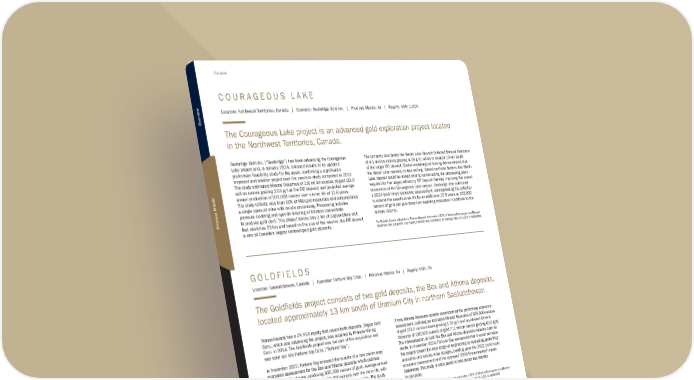 G O L D F I E L D S Location: Saskatchewan, Canada | Operator: Fortune Bay Corp. | Precious Metals: Au | Royalty: NSR: 2% The Goldfields project consists of two gold deposits, the Box and Athona deposits, located approximately 13 km south of Uranium City in northern Saskatchewan. Franco-Nevada has a 2% NSR royalty that covers both deposits. Brigus Gold Corp., which was advancing the project, was acquired by Primero Mining Corp. in 2014. The Goldfields project was not part of the acquisition and was spun out into Fortune Bay Corp. (“Fortune Bay”). In November 2022, Fortune Bay released the results of a new preliminary economic assessment for the Box and Athona deposits which outlines an 8.3-year life-of-mine, producing 835,000 ounces of gold. Average annual gold production is expected to be 101,000 ounces over the mine life, with an average of 122,000 ounces per year in the first four years. The study contemplates conventional open pit mining methods with a standard free milling flowsheet, incorporating gravity and leaching of the gravity tails. A new Mineral Resource update accompanied the preliminary economic assessment, outlining an Indicated Mineral Resource of 979,900 ounces of gold (23.2 million tonnes grading 1.31 g/t) and an Inferred Mineral Resource of 210,800 ounces of gold (7.1 million tonnes grading 0.92 g/t). The mineralization at both the Box and Athona deposits remains open at depth. In November 2024, Fortune Bay announced that it would advance the project toward the next stage of engineering by evaluating permitting scenarios and various mine designs, building upon the 2022 preliminary economic assessment and the approved 2008 Environmental Impact Statement. The study is anticipated to take about two months to complete. For Royalty Ounce calculation, Franco-Nevada estimates 100% of Mineral Resources and Mineral Reserves are subject to our royalty interest and estimates a rate of 2.0% is applicable C O U R A G E O U S L A K E Location: Northwest Territories, Canada | Operator: Seabridge Gold Inc. | Precious Metals: Au | Royalty: NSR: 1.02% The Courageous Lake project is an advanced gold exploration project located in the Northwest Territories, Canada. Seabridge Gold Inc. (“Seabridge”) has been advancing the Courageous Lake project and, in January 2024, released results of its updated preliminary feasibility study for the asset, confirming a significantly improved and smaller project over the previous study completed in 2012. The study estimated Mineral Reserves of 2.8 million ounces of gold (33.9 million tonnes grading 2.61 g/t at the FAT deposit) and projected average annual production of 201,000 ounces over a mine life of 12.6 years. The study reflects less than 30% of M&I gold resources and contemplates a single open pit mine with on-site processing. Processing includes pressure oxidizing and cyanide leaching of flotation concentrate to produce gold doré. This project covers only 2 km of a greenstone belt that stretches 53 km and based on the size of the reserve, the FAT deposit is one of Canada’s largest undeveloped gold deposits. The property also hosts the Walsh Lake deposit (Inferred Mineral Resource of 4.1 million tonnes grading 4.18 g/t), which is located 10 km south of the larger FAT deposit. Earlier metallurgical testing demonstrated that the Walsh Lake material is free milling. Based on these factors, the Walsh Lake deposit could be mined prior to constructing the processing plant required for the larger, refractory FAT deposit thereby improving the overall economics of the Courageous Lake project. Seabridge also published a 2024 preliminary economic assessment, demonstrating the potential to extend the asset’s mine life by an additional 15.9 years at 205,000 ounces of gold per year based on exploring resources in addition to the current reserve. For Royalty Ounce calculation, Franco-Nevada estimates 100% of Mineral Resources and Mineral Reserves are subject to our royalty interest and estimates an average rate of 1.02% is applicable TSX / NYSE: FNV 58 ★ Franco-Nevada Corporation Canada Overview Precious Metals