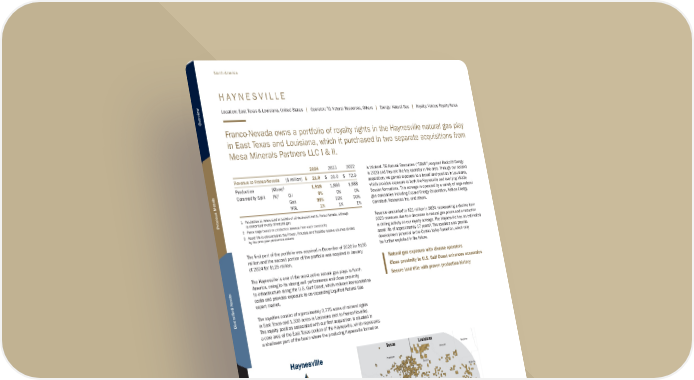 H A Y N E S V I L L E Location: East Texas & Louisiana, United States | Operator: TG Natural Resources, Others | Energy: Natural Gas | Royalty: Various Royalty Rates Franco-Nevada owns a portfolio of royalty rights in the Haynesville natural gas play in East Texas and Louisiana, which it purchased in two separate acquisitions from Mesa Minerals Partners LLC I & II. 2024 2023 2022 Revenue to Franco-Nevada ($ million) $ 21.0 $ 26.0 $ 72.9 Production (Mboe)1 1,918 1,886 1,988 Commodity Split (%)2 Oil 0% 0% 0% Gas 99% 99% 99% NGL 1% 1% 1% 1 Production is referenced in barrels of oil equivalent net to Franco-Nevada, although is comprised mostly of natural gas 2 Percentage based on production revenue from each commodity 3 Asset life is calculated as the Proven, Probable and Possible reserve volumes divided by the prior year production volume The first part of the portfolio was acquired in December of 2020 for $135 million and the second portion of the portfolio was acquired in January of 2024 for $125 million. The Haynesville is one of the most active natural gas plays in North America, owing to its strong well performance and close proximity to infrastructure along the U.S. Gulf Coast, which reduces transportation costs and provides exposure to an expanding Liquified Natural Gas export market. The royalties consist of approximately 2,775 acres of mineral rights in East Texas and 1,330 acres in Louisiana (net to Franco-Nevada). The royalty position associated with our first acquisition is situated in a core area of the East Texas portion of the Haynesville, which represents a shallower part of the basin where the producing Haynesville formation is thickest. TG Natural Resources (“TGNR”) acquired Rockcliff Energy in 2023 and they are the key operator in the area. Through our second acquisition, we gained exposure to a broad land position in Louisiana, which provides exposure to both the Haynesville and overlying Middle Bossier formations. This acreage is operated by a variety of large natural gas companies including Expand Energy Corporation, Aethon Energy, Comstock Resources Inc. and others. Revenue amounted to $21 million in 2024, representing a decline from 2023 revenues due to a decrease in natural gas prices and a reduction in drilling activity on our royalty acreage. The Haynesville has an estimated asset life of approximately 17 years³. The royalties also provide development potential in the Cotton Valley formation, which may be further exploited in the future. Haynesville N 15 0 mile 10 0 kilometer Texas Eagle Ford Barnett Haynesville Bossier NEW MEXICO Louisiana Oklahoma Arkansas Regional Basins Tuscaloosa Fayetteville Woodford Spraberry Bend Permian Basin Anadarko Basin Ardmore Basin Arkomo Basin Fort Worth Basin FNV Royalty Acreage Harrison Panola Shelby Rusk Nacogdoches San Augustine Angelina Sabine Natchitoches Red River De Soto Bienville Webster Bossier Caddo Texas Louisiana Natural gas exposure with diverse operators Close proximity to U.S. Gulf Coast enhances economics Secure land title with proven production history TSX / NYSE: FNV 106 ★ Franco-Nevada Corporation North America Overview Precious Metals Diversified Assets
