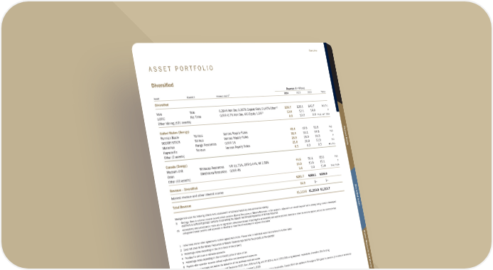 A S S E T P O R T F O L I O Diversified Revenue ($ millions) Asset Operator Interest and %1 2024 2023 2022 Notes Diversified Vale Vale 0.264% Iron Ore, 0.367% Copper/Gold, 0.147% Other 10 $36.7 $35.1 $40.7 Px3, Ex1 LIORC Rio Tinto GORR 0.7% Iron Ore, IOC Equity 1.5%11 13.8 12.1 14.8 P Other Mining (101 assets) 8.2 13.2 6.9 Px10, Ax7, Ex84 United States (Energy) Permian Basin Various Various Royalty Rates 45.4 47.6 52.6 Px2 SCOOP/STACK Various Various Royalty Rates 31.4 33.1 57.8 Px3 Marcellus Range Resources GORR 1% 26.9 28.0 56.5 P Haynesville Various Various Royalty Rates 21.0 26.0 72.9 Px2 Other (2 assets) 0.3 0.3 0.3 Px1, Ex1 Canada (Energy) Weyburn Unit Whitecap Resources NRI 11.71%, ORR 0.44%, WI 2.56% 44.6 50.1 65.0 Px3 Orion Strathcona Resources GORR 4% 14.0 13.6 15.1 P Other (69 assets) 9.4 9.0 13.4 Px43, Ex26 Revenue – Diversified $251.7 $268.1 $396.0 Interest revenue and other interest income $8.9 $− $− Total Revenue $1,113.6 $1,219.0 $1,315.7 Management uses the following criteria in its assessment of technical feasibility and commercial viability: (i) Geology: there is a known mineral deposit which contains Mineral Resources or Mineral Reserves; or the project is adjacent to a mineral deposit that is already being mined or developed and there is sufficient geologic certainty of converting the deposit into Mineral Resources or Mineral Reserves (ii) Accessibility and authorization: there are no significant unresolved issues impacting the accessibility and authorization to develop or mine the mineral deposit, and social, environmental and governmental permits and approvals to develop or mine the mineral deposit appear obtainable 1 Initial rates shown when agreements contain agreed reductions. Please refer to individual asset descriptions for further detail 2 Does not cover all the Mineral Resources or Mineral Reserves reported for the property by the operator 3 Percentage varies depending on the claim block of the property 4 Provides for minimum or advance payments 5 Percentage varies depending on the commodity price or value of ore 6 Payable after operator recovers defined exploration and development expenses 7 These revenue numbers are before the deduction of the purchase cost per ounce 8 8,760 oz Au & 291,000 oz Ag per year until December 2025; then, 63% Au & Ag until 87,600 oz Au & 2,910,000 oz Ag delivered, respectively; thereafter, 25% Au & Ag 9 Sabodala agreement was amended with an effective date of September 1, 2020 10 Net sales royalty attributable to FNV Royalty holding on certain properties and subject to certain thresholds. Copper/Gold rate applies to Sossego at 50% given its previous joint venture ownership 11 GORR and IOC equity interest attributable to FNV 9.9% equity ownership of Labrador Iron Ore Royalty Corporation 12 Cobre Panama currently on preservation and safe management Franco-Nevada Corporation ★ 11 TSX / NYSE: FNV Overview Additional Information Mineral Resources and Mineral Reserves Diversified Assets Precious Metals
