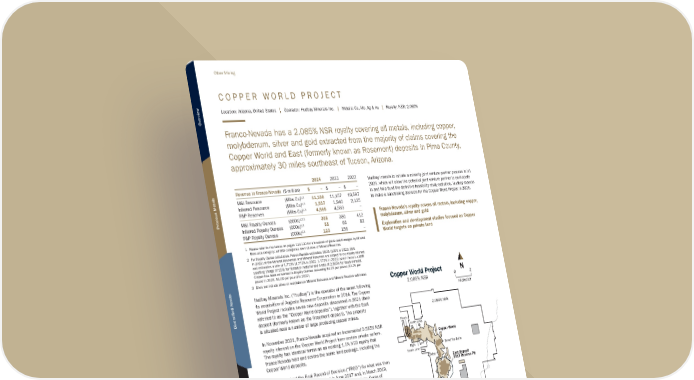 C O P P E R W O R L D P R O J E C T Location: Arizona, United States | Operator: Hudbay Minerals Inc. | Metals: Cu, Mo, Ag & Au | Royalty: NSR: 2.085% Franco-Nevada has a 2.085% NSR royalty covering all metals, including copper, molybdenum, silver and gold extracted from the majority of claims covering the Copper World and East (formerly known as Rosemont) deposits in Pima County, approximately 30 miles southeast of Tucson, Arizona. 2024 2023 2022 Revenue to Franco-Nevada ($ million) $ − $ – $ – M&I Resource (Mlbs Cu)1,3 11,100 11,157 10,597 Inferred Resource (Mlbs Cu)1,3 1,957 1,940 2,125 P&P Reserves (Mlbs Cu)1,3 4,585 4,583 – M&I Royalty Ounces (000s)1,2,3 305 380 412 Inferred Royalty Ounces (000s)2,3 55 66 83 P&P Royalty Ounces (000s)2,3 123 156 – 1 Please refer to the tables on pages 114-120 for a breakout of grade and tonnages by Mineral Resource category; all M&I categories are inclusive of Mineral Reserves 2 For Royalty Ounce calculation, Franco-Nevada estimates 100% (100% in 2023, 99% in 2022) of the Mineral Resources and Mineral Reserves are subject to our royalty interest and estimates a rate of 1.772% (1.772% in 2022, 1.772% in 2021) (which factors a NSR smelting charge of 15%) for floatation material and a rate of 2.085% for leach material. Copper has been converted to Royalty Ounces assuming $4.25 per pound ($3.75 per pound in 2023, $4.00 per pound in 2022) 3 Does not include silver or molybdenum Mineral Resource and Mineral Reserve estimates Hudbay Minerals Inc. (“Hudbay”) is the operator of the asset following its acquisition of Augusta Resource Corporation in 2014. The Copper World Project includes seven new deposits discovered in 2021 (then referred to as the “Copper World deposits”), together with the East deposit (formerly known as the Rosemont deposit). The property is situated near a number of large producing copper mines. In November 2021, Franco-Nevada acquired an incremental 0.585% NSR royalty interest on the Copper World Project from certain private sellers. The royalty has identical terms as an existing 1.5% NSR royalty that Franco-Nevada held and covers the same land package, including the Copper World deposits. Hudbay received the Final Record of Decision (“FROD”) for what was then referred to as the Rosemont project in June 2017 and, in March 2019, received the Section 404 Water Permit from the U.S. Army Corps of Engineers (“ACOE”). In July 2019, the U.S. District Court for Arizona issued a ruling that vacated the FROD issued by the U.S. Forest Service. Hudbay appealed the ruling to the U.S. Court of Appeals for the Ninth Circuit. In May 2022, the U.S. Court of Appeals for the Ninth Circuit affirmed the U.S. District Court of Arizona’s decision in July 2019. In recent years, Hudbay has focused on advancing the Copper World Project which is on private land covered by Franco-Nevada’s royalty. In September 2023, Hudbay released an enhanced Pre-Feasibility Study (PFS) for the Copper World Complex. The PFS announced a Mineral Reserve estimate of 385 million ore tonnes at 0.54% copper and a Mineral Resource of 1,205 million ore tonnes at 0.42% copper. The PFS also announced Inferred Mineral Resources of 275 million ore tonnes at 0.32% copper. The PFS reflects a two-phase mine plan with the first phase reflecting a standalone operation with processing infrastructure on Hudbay’s private land and mining occurring on portions of the deposits located on patented mining claims. The first phase of the mine plan requires only state and local permits which were obtained in January 2025. The Copper World Project anticipates producing an average of approximately 85,000 tonnes of copper per year for 20 years. The second phase expands mining activities onto federal land and extends the mine life well beyond 20 years. Hudbay intends to initiate a minority joint venture partner process in H1 2025, which will allow the potential joint venture partner to participate in and help fund the definitive feasibility study activities. Hudbay expects to make a sanctioning decision for the Copper World Project in 2026. Copper World Project 2.085% NSR 2.085% NSR kilometer 2 0 N Patented Royalty Licences Mineral Resources Unpatented Royalty Licences Excluded from Royalty Peach North Limb Elgin South Limb Broad Top Butte Bolsa Copper World East Deposit 2017 Reserve Pit 83 Copper World Project Pacifc Ocean Oregon Idaho Utah Nevada California Arizona Mexico Franco-Nevada’s royalty covers all metals, including copper, molybdenum, silver and gold Exploration and development studies focused on Copper World targets on private land TSX / NYSE: FNV 94 ★ Franco-Nevada Corporation Other Mining Overview Precious Metals Diversified Assets