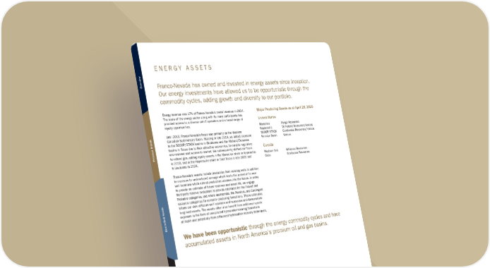 E N E R G Y A S S E T S Franco-Nevada has owned and invested in energy assets since inception. Our energy investments have allowed us to be opportunistic through the commodity cycles, adding growth and diversity to our portfolio. Energy revenue was 17% of Franco-Nevada’s overall revenue in 2024. The scale of the energy sector along with its many participants has provided access to a diverse set of operators and a broad range of royalty opportunities. Until 2016, Franco-Nevada’s focus was primarily on the Western Canadian Sedimentary Basin. Starting in late 2016, we added exposure to the SCOOP/STACK basins in Oklahoma and the Midland/Delaware basins in Texas due to their attractive economics, favourable regulatory environment and access to market. We subsequently shifted our focus to natural gas, adding royalty assets in the Marcellus shale in Appalachia in 2019, and in the Haynesville shale in East Texas in late 2020 and in Louisiana in 2024. Franco-Nevada’s assets include production from existing wells in addition to exposure to undeveloped acreage which hosts the potential for new well locations which extend production volumes into the future. In order to provide an estimate of future reserves and asset life, we engage third-party reserve evaluators to provide estimates for the Proved and Probable categories, and where appropriate, the Possible, and Contingent resource categories for currently producing formations. These estimates inform our view of future well locations and resources and demonstrate long-lived assets. The assets often also benefit from additional upside exposure in the form of unexploited hydrocarbon-bearing formations at depth and potentially from enhanced hydrocarbon recovery techniques. Major Producing Assets as at April 28, 2025 United States Marcellus Range Resources Haynesville TG Natural Resources/Various SCOOP/STACK Continental Resources/Various Permian Basin Various Canada Weyburn Unit Whitecap Resources Orion Strathcona Resources We have been opportunistic through the energy commodity cycles and have accumulated assets in North America's premium oil and gas basins. Oil and Gas Information Advisory In this Asset Handbook, certain natural gas volumes have been converted to barrels of oil equivalent on the basis of six Mcf to one bbl. Boe and mboe may be misleading, particularly if used in isolation. A conversion ratio of six Mcf to one bbl is based on an energy equivalency ratio and does not represent a value equivalency. TSX / NYSE: FNV 102 ★ Franco-Nevada Corporation Overview Precious Metals Diversified Assets
