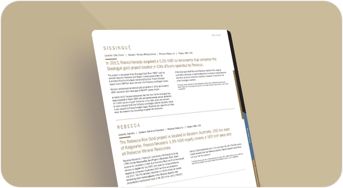 R E B E C C A Location: Australia | Operator: Ramelius Resources | Precious Metals: Au | Royalty: NSR: 1.5% The Rebecca-Roe Gold project is located in Western Australia, 150 km east of Kalgoorlie. Franco-Nevada’s 1.5% NSR royalty covers a 160 km2 area and all Rebecca Mineral Resources. Ramelius Resources (“Ramelius”) completed a Pre-Feasibility Study (“PFS”) for the Rebecca-Roe Gold Project in December 2024. Board approval for completion of Definitive Feasibility Study and Final Investment decision is targeted for July 2025, with open pit mining at Rebecca targeted to commence September 2026 and first ore production July 2027. The PFS summary describes a 3 million tonne per annum processing plant located adjacent to the Rebecca deposit, total pre-production development costs of A$ 225 million, and 1,060,000 ounces of gold production over a nine year mine life, with 700,000 ounces of gold sourced from the Rebecca deposits. Franco-Nevada’s royalty does not cover the Roe deposits. For Royalty Ounce calculation, Franco-Nevada estimates 100% of Mineral Resources and Mineral Reserves are subject to our royalty interest and estimates a rate of 1.5% is applicable P E R A M A H I L L Location: Greece | Operator: Eldorado Gold Corporation | Precious Metals: Au | Royalty: NSR: 2% Franco-Nevada has a 2% NSR on the Perama Hill project held by Eldorado Gold Corporation (“Eldorado”). The Perama Hill gold project is located in the Thrace region of northeastern Greece and consists of two mining titles covering an area of 19 km2 and two mining exploration licenses covering an area of 18 km2. Perama Hill has an estimated Mineral Reserve of 997,000 ounces (10.3 million tonnes grading 3.01 g/t) and contemplates operating as a small open pit mine using a conventional carbon-in-leach gold recovery circuit with a 10-year Reserve mine life at approximately 100,000 ounces of gold per year. Eldorado has reported that the project is the next mine it expects to develop in Greece after the Skouries project, where commercial production is expected in mid-2026. Exploration potential in the region supports opportunities for growth, with social/environmental due diligence continuing in 2025 along with project optimization and studies. Future developments include advancing through the EIA process. For Royalty Ounce calculation, Franco-Nevada estimates 100% of Mineral Resources and Mineral Reserves are subject to our royalty interest and estimates a rate of 2.0% is applicable S I S S I N G U É Location: Côte d’Ivoire | Operator: Perseus Mining Limited | Precious Metals: Au | Royalty: NSR: 0.5% In 2013, Franco-Nevada acquired a 0.5% NSR on tenements that comprise the Sissingué gold project located in Côte d’Ivoire operated by Perseus. The project is comprised of the Sissingué Gold Mine (“SGM”) and the satellite deposits Fimbiasso and Bagoé, located approximately 40 kilometres from the Sissingué processing facilities. Franco-Nevada’s royalty covers SGM but does not cover the Fimbiasso and Bagoé claims. Perseus commenced commercial gold production in 2018 and reported 2024 production from Sissingué of 69,407 ounces of gold. In March 2022, Perseus announced that the mine life for Sissingué had been extended to March 2026 with estimated average annual production of 72,000 ounces of gold. Production in the latter years was forecast to come primarily from the Fimbiasso and Bagoé satellite deposits, which is not covered by Franco-Nevada’s royalty. Potential was noted for a further mine life extension by processing low grade ore stockpiles. At the Sissingué Gold Mine and Fimbiasso Satellite Pits, ongoing exploration continues to identify extensions to existing mineral deposits and other prospects that have significant potential to extend the life of the Sissingué operation. For Royalty Ounce calculation, Franco-Nevada estimates 100% of Mineral Resources and Mineral Reserves at Sissingué are subject to our royalty interest and estimates a rate of 0.5% is applicable Franco-Nevada Corporation ★ 81 TSX / NYSE: FNV Rest of World Additional Information Mineral Resources and Mineral Reserves Diversified Assets
