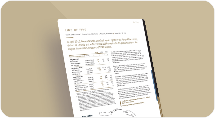 R I N G O F F I R E Location: Ontario, Canada | Operator: Wyloo Metals Pty Ltd | Metals: Cr, Ni, Cu & PGM | Royalty: NSR / GR: 1-3% In April 2015, Franco-Nevada acquired royalty rights in the Ring of Fire mining district of Ontario and in December 2019 acquired a 1% gross royalty on the Eagle’s Nest nickel, copper and PGM deposit. 2024 2023 2022 Revenue to Franco-Nevada ($ million) $ − $ – $ – Ring of Fire (Cr) M&I Resource (Tonnes millions)1 193 193 193 Inferred Resource (Tonnes millions)1 55 55 55 P&P Reserves (Tonnes millions)1 − – – Eagle’s Nest (PGM) M&I Resource (koz PGM)1 1,408 1,408 1,627 Inferred Resource (koz PGM)1 943 943 1,459 P&P Reserves (koz PGM)1 − – 1,489 Eagle's Nest (Ni) M&I Resource (Mlbs Ni)1 375 375 432 Inferred Resource (Mlbs Ni)1 249 249 228 P&P Reserves (Mlbs Ni)1 − – 413 M&I Royalty Ounces (000s)1,2 336 200 225 Inferred Royalty Ounces (000s)2 99 61 74 P&P Royalty Ounces (000s)2 − – 20 1 Please refer to the tables on pages 114-120 for a breakout of grade and tonnages by Mineral Resource category; all M&I categories are inclusive of Mineral Reserves 2 For the Ring of Fire Royalty Ounce calculation, Franco-Nevada estimates 100% of the Mineral Resources are subject to our royalty interest and estimates a dollar per tonne value of $4.75/tonne. For the Eagle’s Nest Royalty Ounce calculation, Franco-Nevada estimates 100% of the PGM and nickel Mineral Resources and Mineral Reserves are subject to our royalty interest and estimates an average rate of 1.0% is applicable for PGM and 0.7% for nickel (which factors a NSR smelting charge of 30%). PGM ounces are converted into Royalty Ounces assuming $950/ounce Pt ($850/ounce Pt in 2023, $900/ounce Pt in 2022) and $950/ounce Pd ($900/ounce Pd in 2023, $1,500/ounce Pd in 2022) and nickel has been converted to Royalty Ounces assuming $7.89 per pound ($7.89 per pound in 2023, $11.00 per pound in 2022). Copper Mineral Resources and Mineral Reserves are not included in the Royalty Ounce calculation The 2015 funding package allowed Noront Resources Ltd. (“Noront”) to acquire mining claims from Cliffs Natural Resources Inc. (“Cliffs”) in the Ring of Fire mining district, 500 km northeast of Thunder Bay. Franco-Nevada secured royalty rights over an estimated 1,000 km2 area, offering long-term exposure in a potential new mining camp to one of the largest chromite resources globally, in addition to nickel, copper, and PGM deposits. Franco-Nevada holds a 3% royalty over the Black Thor chromite deposit, a 2% royalty over all of Noront’s property in the region (excluding the Eagle’s Nest deposit, see below), 2% on certain other properties previously being advanced by Cliffs, and a number of other third-party exploration royalties. In December 2019, Franco-Nevada acquired a 1% gross royalty on Noront’s Eagle’s Nest nickel, copper and PGM deposit, for $3.8 million. Eagle’s Nest currently has over 624 million pounds (15.7 million tonnes grading 1.80% nickel) of high-grade nickel mineralization in Measured, Indicated and Inferred Mineral Resources, with significant copper, palladium and platinum content. In 2022, Noront was acquired by Wyloo Metals Pty Ltd (“Wyloo Metals”), who are advancing the projects. In December 2022, Wyloo Metals (now known as Ring of Fire Metals) signed a Memorandum of Understanding with Webequie First Nation, detailing how the two parties would work together to progress ongoing exploration activities as well as negotiations on a partnership agreement for the proposed Eagle’s Nest mine. Royalty licences 2% GR (Cr), 2% NSR (other) Wyloo licences Ring of Fire 1-3% NSR/GR kilometer 20 0 N Royalty licences 2-3% GR (Cr), 2-3% NSR (other) Thunderbird Blue Jay Black Label Black Thor Eagle’s Nest 1% GR Blackbird Eagle 2 Triple J Quebec Ontario Ring of Fire Royalty concession estimated to cover over 1,000 km² Wyloo as new operator Permitting for the access road is ongoing Franco-Nevada Corporation ★ 95 TSX / NYSE: FNV Other Mining Additional Information Mineral Resources and Mineral Reserves