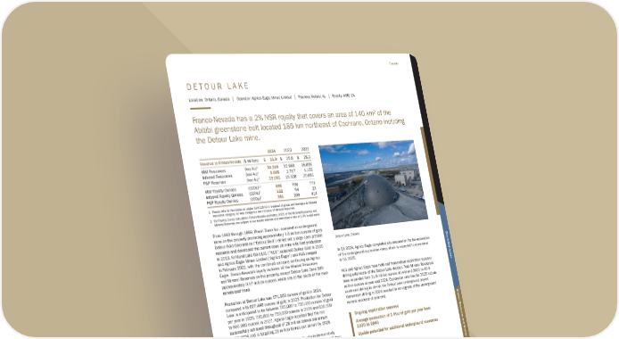 D E T O U R L A K E Location: Ontario, Canada | Operator: Agnico Eagle Mines Limited | Precious Metals: Au | Royalty: NSR: 2% Franco-Nevada has a 2% NSR royalty that covers an area of 140 km2 of the Abitibi greenstone belt located 185 km northeast of Cochrane, Ontario including the Detour Lake mine. 2024 2023 2022 Revenue to Franco-Nevada ($ million) $ 31.9 $ 25.9 $ 26.3 M&I Resources (koz Au)1 34,310 37,883 38,638 Inferred Resources (koz Au)1 6,605 2,717 1,156 P&P Reserves (koz Au)1 19,051 19,928 20,683 M&I Royalty Ounces (000s)1,2 686 758 773 Inferred Royalty Ounces (000s)2 132 54 23 P&P Royalty Ounces (000s)2 381 399 414 1 Please refer to the tables on pages 114-120 for a breakout of grade and tonnages by Mineral Resource category; all M&I categories are inclusive of Mineral Reserves 2 For Royalty Ounce calculation, Franco-Nevada estimates 100% of the Mineral Resources and Mineral Reserves are subject to our royalty interest and estimates a rate of 2.0% is applicable From 1983 through 1999, Placer Dome Inc. operated an underground mine on the property producing approximately 1.8 million ounces of gold. Detour Gold Corporation (“Detour Gold”) drilled out a large open pittable resource and developed the current open pit mine with first production in 2013. Kirkland Lake Gold Ltd. (“KLG”) acquired Detour Gold in 2020 and Agnico Eagle Mines Limited (“Agnico Eagle”) and KLG merged in February 2022, with the combined company continuing as Agnico Eagle. Franco-Nevada’s royalty includes all the Mineral Resources and Mineral Reserves on the property, except Detour Lake Zone 58N (approximately 0.67 million ounces) which sits to the south of the main mineralized trend. Production at Detour Lake was 671,950 ounces of gold in 2024, compared with 677,446 ounces of gold in 2023. Production for Detour Lake is anticipated to be between 705,000 to 735,000 ounces of gold per year in 2025, 720,000 to 750,000 ounces in 2026 and 630,000 to 660,000 ounces in 2027. Agnico Eagle reported that the mill successfully achieved throughput of 28 million tonnes per annum in Q4 2024 and is targeting 29 million tonnes per annum by 2028. In June 2024, Agnico Eagle released the results of a technical study reflecting the potential for a concurrent underground operation at Detour Lake which would extend the life of mine to 2054. Average annual gold production is expected to be approximately 708,000 ounces per year between Q2 2024 and 2029, increasing to 1,011,000 ounces per year from 2030 to 2043 when the underground is in production. Processing of stockpiles between 2044 and 2054 will average 314,000 ounces per year, with upside potential for additional underground mineral resources to be added along the western plunge of the deposit. In Q4 2024, Agnico Eagle completed site preparation for the excavation of the underground exploration ramp, which is expected to commence in H1 2025. KLG and Agnico Eagle have both had tremendous exploration success drilling extensions of the Detour Lake deposit. Total Mineral Resources have expanded from 21.9 million ounces at year end 2020 to 40.9 million ounces at year end 2024. Exploration priorities for 2025 include continued drilling to de-risk the Detour Lake underground project. Conversion drilling in 2024 resulted in an upgrade of the underground mineral resource at year-end. Detour Lake, Ontario Ongoing exploration success Average production of 1 Moz of gold per year from 2030 to 2043 Upside potential for additional underground resources Franco-Nevada Corporation ★ 41 TSX / NYSE: FNV Canada Additional Information Mineral Resources and Mineral Reserves Diversified Assets