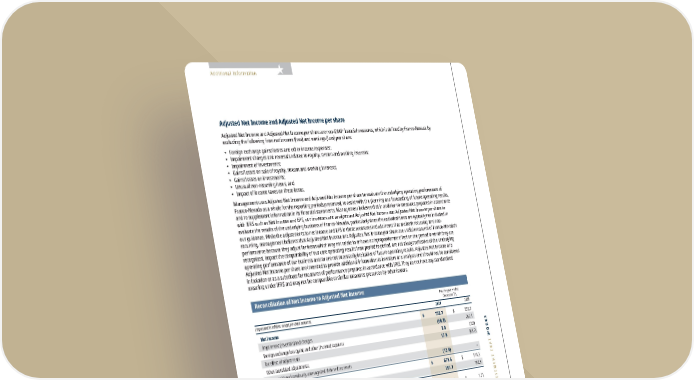 FRANCO-NEVADA CORPORATION 149 Additional Information ADDITIONAL INFORMATION THE GOLD INVESTMENT THAT WORKS Adjusted Net Income and Adjusted Net Income per share Adjusted Net Income and Adjusted Net Income per share are non-GAAP financial measures, which is defined by Franco-Nevada by excluding the following from net income (loss) and earnings (loss) per share: • Foreign exchange gains/losses and other income/expenses; • Impairment charges and reversals related to royalty, stream and working interests; • Impairment of investments; • Gains/losses on sale of royalty, stream and working interests; • Gains/losses on investments; • Unusual non-recurring items; and • Impact of income taxes on these items. Management uses Adjusted Net Income and Adjusted Net Income per share to evaluate the underlying operating performance of Franco-Nevada as a whole for the reporting periods presented, to assist with the planning and forecasting of future operating results, and to supplement information in its financial statements. Management believes that in addition to measures prepared in accordance with IFRS such as Net Income and EPS, our investors and analysts use Adjusted Net Income and Adjusted Net Income per share to evaluate the results of the underlying business of Franco-Nevada, particularly since the excluded items are typically not included in our guidance. While the adjustments to net income and EPS in these measures include items that are both recurring and non- recurring, management believes that Adjusted Net Income and Adjusted Net Income per share are useful measures of Franco-Nevada’s performance because they adjust for items which may not relate to or have a disproportionate effect on the period in which they are recognized, impact the comparability of our core operating results from period to period, are not always reflective of the underlying operating performance of our business and/or are not necessarily indicative of future operating results. Adjusted Net Income and Adjusted Net Income per share are intended to provide additional information to investors and analysts and should not be considered in isolation or as a substitute for measures of performance prepared in accordance with IFRS. They do not have any standardized meaning under IFRS and may not be comparable to similar measures presented by other issuers. Reconciliation of Net Income to Adjusted Net Income: For the year ended December 31, (expressed in millions, except per share amounts) 2021 2020 Net income $ 733.7 $ 326.2 Impairment (reversals) and charges (68.0 ) 262.1 Foreign exchange loss (gain) and other (income) expenses 3.0 (2.8 ) Tax effect of adjustments 17.8 (69.2 ) Other tax related adjustments: Recognition of previously unrecognized deferred tax assets (12.9 ) – Adjusted Net Income $ 673.6 $ 516.3 Basic weighted average shares outstanding 191.1 190.3 Basic earnings per share $ 3.84 $ 1.71 Impairment charges (0.36 ) 1.38 Foreign exchange loss (gain) and other (income) expenses 0.02 (0.01 ) Tax effect of adjustments 0.09 (0.37 ) Other tax related adjustments: Recognition of previously unrecognized deferred tax assets (0.07 ) – Adjusted Net Income per share $ 3.52 $ 2.71