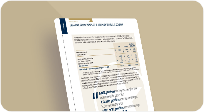 2022 ASSET HANDBOOK 34 FNV TSX NYSE OVERVIEW Royalty Ounces EXAMPLE ECONOMICS OF A ROYALTY VERSUS A STREAM The example below compares the value per ounce to Franco-Nevada of a 4% NSR, a 4% stream or a 4% NPI or WI. Assume for one ounce of gold, a sales price of $1,800, a “stream cost” of $400 per ounce and that the “all-in sustaining cost” 1 of the mine is $1,026 per ounce. Developed NSR Stream NPI or WI 1 One ounce sold at $ 1,800 $ 1,800 $ 1,800 Applicable cost $ – $ 400 $ 1,026 Margin for AISC calculation $ 1,800 $ 1,400 $ 774 NSR, Stream or NPI % 4% 4% 4% Revenue per ounce to FNV $ 72 $ 56 $ 31 NSR equivalent 100% 78% 43% Alternatively – Ounces required to equal a 1% NSR 1.0 oz 1.3 oz 2.3 oz 1 For applicable costs for a developed NPI or WI, Franco-Nevada is, for illustrative purposes, assuming Barrick Gold Corporation’s (“Barrick”) 2021 all-in sustaining cash cost measure, as Barrick is the operator of two assets at which Franco-Nevada has NPI interests. Based on the above economics, a comparable percentage NSR is 2.3 times more valuable than an equivalent Developed NPI or WI and almost 1.3 times more valuable than a stream interest. The NSR provides the highest margins and most downside protection to changes in the commodity price. The stream provides commodity price leverage similar to a low cost operating company with certainty as to future costs. The NPI or WI provides the most leverage to commodity price. A NSR provides the highest margins and most downside protection A Stream provides leverage to changes in the commodity price A NPI or WI provides the most leverage to commodity price. “ ” Duketon Mine, Australia