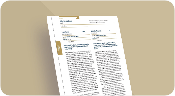 2022 ASSET HANDBOOK 80 FNV TSX NYSE PRECIOUS METALS Canada Other Canada Assets Canada Precious Metals Please refer to the tables on pages 128-136 for a breakout of grade and tonnages by Mineral Resource category. Franco-Nevada holds a 1% NSR on the past-producing Eskay Creek gold-silver project in British Columbia’s Golden Triangle. Eskay Creek was the highest-grade gold mine in the world when in production, producing 3.3 million ounces of gold and 160 million ounces of silver at average grades of 45 g/t gold and 2,224 g/t silver from 1994-2008. In July 2021, Skeena Resources Limited (“Skeena”) announced a positive prefeasibility study, outlining average annual production of 249,000 ounces of gold and 7.2 million ounces of silver over a 10-year mine life. The prefeasibility study indicated a high-grade open-pit with Proven and Probable Mineral Reserves of 3.88 Moz AuEq (26.4 Mt at 3.37 g/t Au and 94 g/t Ag) and a mill throughput of 7,945 tpd with a flotation plant producing saleable concentrate. Skeena anticipates further increases to the annual production profile as part of a feasibility study expected in 2022. In December 2021, Franco-Nevada entered into an agreement with Skeena to amend the terms of its existing 1% NSR royalty agreement such that the existing royalty will cover substantially all of the Eskay Creek gold-silver project land package, including all currently-known mineralized zones. Franco-Nevada was also granted by Skeena a right of first refusal over the sale of a 0.5% NSR royalty on Eskay Creek. If Skeena has not sold the 0.5% NSR royalty by October 2, 2023, Franco-Nevada will have the right to purchase this royalty for C$22.5 million. In January 2022, Skeena released positive exploration results with the discovery of the 23 Zone and, in March 2022, announced the 21A West Zone Expansion discovery, both of which are covered by Franco-Nevada’s royalty. For Royalty Ounce calculation, Franco-Nevada estimates 100% of the Mineral Reserves and Mineral Resources are subject to our royalty interest and estimates a rate of 1% is applicable Eskay Creek Au & Ag British Columbia, Canada Operator: Skeena Resources Limited Royalty: NSR: 1% Precious Metals Franco-Nevada has a 2% NSR (subject to a buy-back of 0.5%) on the water claims, which cover the majority of Mineral Reserves, of the Bateman gold project in Red Lake, Ontario. In July 2020, Rubicon Minerals Corp. (“Rubicon”) completed its corporate name change to Battle North Gold Corporation (“Battle North”), while also changing the name of the Phoenix gold project to the Bateman gold project. In May 2021, Evolution Mining Limited (“Evolution Mining”) announced the completion of its acquisition of Battle North. Under Evolution Mining, Bateman is being reported under Red Lake for public reporting purposes (Franco-Nevada does not have a royalty on Evolution Mining’s other Red Lake properties). The consolidated operation will consist of the Lower Red Lake, Upper Campbell, Cochenour and McFinley mining areas that will provide ore to the Campbell, Red Lake and Bateman mills with a total processing capacity target of two million tonnes by 2026. Ore from the deposits not covered by Franco-Nevada’s royalty will likely be higher priority through the mills in the short to medium term. The Bateman project is located 10 km north of Evolution Mining’s Red Lake mine. In November 2015, Rubicon announced a temporary shutdown of underground activities to enhance its geologic model and develop an implementation plan as the gold mineralization was more geologically complex than anticipated. This included a material reduction to the contained gold ounces estimated. In October 2020, Battle North announced feasibility study results for the Bateman gold project. The base case study outlined life of mine payable gold production of 602,987 ounces, averaging 73,835 ounces per year for 8.2 years from initial production. Of the 8.2 years, 7 years were classified as commercial production, which the company defined as an average of 70% of the 1,250 tpd permitted capacity, over 90 consecutive days. The project contemplated an 1,800 tpd mill with excess capacity for potential incremental tonnes from F2, McFinley and Pen Zones (contemplating 2,500 tpd for the expanded mill). The 1,800 tpd mill was constructed in 2015 prior to shut down and is currently permitted to 1,250 tpd. Evolution Mining anticipates that the Battle North acquisition will enable growth plans to be accelerated at Red Lake. The acquisition also provides Evolution Mining the opportunity to build on its track record as a safe and sustainable operator for the long-term benefit of a broad range of stakeholders including the local workforce, regional communities and the Wabauskang and Lac Seul First Nation Partners. For Royalty Ounce calculation, Franco-Nevada estimates 100% of the Mineral Reserves and Mineral Resources are subject to our royalty interest and estimates a rate of 1.5% is applicable in anticipation that Evolution Mining exercises its right to repurchase 0.5% of the 2.0% NSR Red Lake (Bateman) Au Ontario, Canada Operator: Evolution Mining Limited Royalty: NSR: 2% Precious Metals