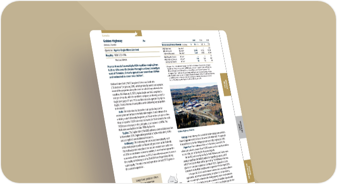 FRANCO-NEVADA CORPORATION 77 THE GOLD INVESTMENT THAT WORKS Canada PRECIOUS METALS DIVERSIFIED ASSETS RESERVES AND RESOURCES ADDITIONAL INFORMATION Large land position offers future potential KLG merged with Agnico Eagle 2021 2020 2019 Revenue to Franco-Nevada ($ million) $ 0.1 $ 3.0 $ 7.0 P&P Reserves (koz Au) 1 – – 735 M&I Resource (koz Au) 1 2,978 1,872 1,914 Inferred Resource (koz Au) 1 1,421 1,407 1,394 P&P Royalty Ounces (000s) 2 – – 57 M&I Royalty Ounces (000s) 1, 2 160 138 141 Inf Royalty Ounces (000s) 2 90 90 89 1 Please refer to the tables on pages 128-136 for a breakout of grade and tonnages by Mineral Resource category; all M&I categories are inclusive of Mineral Reserves. Mineral Reserves and Mineral Resources are the sum of Golden Highway - Holt Complex (which includes Holt, Holloway and Taylor) and Golden Highway - Hislop 2 For Royalty Ounce calculation, Franco-Nevada estimates 100% of the Mineral Reserves and Mineral Resources are subject to our royalty interest and estimates rates of: Holt 10%; Holloway 3%; Taylor 1%; Hislop 4%; Aquarius 2% Golden Highway Au Ontario, Canada Operator: Agnico Eagle Mines Limited Royalty: NSR: 0.25-10% Precious Metals Franco-Nevada has multiple NSR royalties ranging from 0.25 to 10% over the Destor-Porcupine mineral trend just east of Timmins, Ontario spread over more than 120 km and estimated to cover over 340 km 2 . Kirkland Lake Gold (“KLG”) acquired St Andrew Goldfields (“St Andrew”) in January 2016, which previously owned and operated most of the properties along the trend on which Franco-Nevada has royalties. On February 8, 2022, Agnico Eagle and KLG completed a merger of equals, with the combined company continuing as Agnico Eagle (see pages 67 and 71 for additional assets operated by Agnico Eagle). Franco-Nevada has royalties on the following key properties in the trend: Holt: The Holt mine has been the main producing asset in recent years and includes the Holt mill complex. Franco-Nevada has a sliding scale NSR royalty beginning at 2% when the gold price is less than or equal to $500/ounce and increasing in 1% increments for each $100/ounce increase in the gold price, to a maximum of 10%. The Holt mine was built in the late 1980s by Barrick. Taylor: The Taylor mine (1% NSR) achieved commercial production in November 2015. Exploration potential at Taylor exists along strike and at depth of current Mineral Resources. Holloway: The Holloway mine is located immediately north of the Holt property with ore historically processed at the Holt mill. The Holloway mine was placed on care and maintenance at the end of 2016 due to limited economic viability. In an effort to improve the economics of the operation, in 2019, Franco-Nevada agreed to reduce the royalty at Holloway to a flat 3% NSR from the previous sliding scale royalty. The mine resumed operations in early 2019, prior to the current suspension. 1% NSR 1-2% NSR 1% NSR 4% NSR 0.25-1% NSR 101 20 kilometres Present or past producing mine Stoughton Stock Mine and Mill Royalty Matheson Porcupine Timmins Lake Abitibi Frederick House Lake Night Hawk Lake Kenogamisis Lake Holloway Mine Holt Mine Jonpol Ross Mine Apollo Black Fox Taylor Royalty Ludgate Kidd Creek Porcupine Peninsula Royal Oak Bell Creek Owl Creek Hoyle Pond Kinross 1060 Zone Broulan Reef Delnite Aunor Paymaster Dome McIntyre Hollinger Hallnor Pamour #1 Matheson German Stock Taylor Cody Macklem Bond Currie Carr Beatty Bowman Hislop Guibord 11 ONR Destor-Porcupine Fault Zone Pipestone Fault Cook Barnet Thackeray Harker Garrison Rand Michaud Munro McCool Aquarius Royalty Hislop Royalty Frecheville Holt Royalty Lamplugh Lake Abitibi 101 11 Marriot Central Timmins Royalty Claims Holloway Royalty Sliding scale 3% NSR Zone 7 Royalty Sliding scale Holloway 0.5-2.5% NSR Stoughton Royalty N Golden Highway Quebec Ontario Hislop: Franco-Nevada has a 4% NSR on the Hislop mine which is located approximately 50 km to the west of the Holt mill. The open-pit Mineral Reserves for the Hislop open pit were fully depleted in 2014. Aquarius: Franco-Nevada holds a 1-2% sliding scale NSR (2% when gold price is greater than $1,000/ounce) on the majority of claims surrounding and including the Aquarius deposit. Under KLG and now Agnico Eagle, Holt, Holloway and Taylor were amalgamated into the Holt Complex for reporting purposes, all of which have fed the Holt mill for processing. The Holloway mine was placed on care and maintenance in March 2020. Operations at the remainder of the Holt Complex were suspended effective April 2020. In August 2020, KLG and Newmont entered into a strategic alliance agreement, with Newmont acquiring an option on certain mining and mineral rights related to the Holt property. Agnico Eagle plans to evaluate the potential to integrate a number of satellite deposits with the existing infrastructure in the region which may displace production from royalty ground in the short to medium term. Golden Highway, Ontario