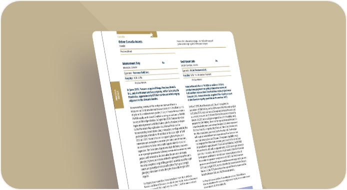 2022 ASSET HANDBOOK 82 FNV TSX NYSE Other Canada Assets Canada Precious Metals Please refer to the tables on pages 128-136 for a breakout of grade and tonnages by Mineral Resource category. Franco-Nevada has a 1% NSR as well as a $10/oz production payment on gold produced in excess of 1.85 million ounces from the Red Mountain project near Stewart, B.C. Franco-Nevada acquired the royalty as part of the Barrick royalty portfolio in November 2013. In March 2019, Ascot Resources Ltd. (“Ascot”) completed its acquisition of IDM Mining and its 100%-owned Red Mountain project. In October 2019, Ascot announced an updated Mineral Resource and as a result, Measured and Indicated Mineral Resources increased by almost 200,000 ounces of gold compared to a 2017 feasibility study prepared by IDM Mining. Based on the updated Mineral Resource a revised feasibility study was released in April 2020 which envisioned the feed from four deposits (Big Missouri, Silver Coin, Premier and Red Mountain) being processed at the Premier mill. The Premier mill required refurbishment and expansion as it had been on care and maintenance for over 20 years. The updated feasibility study contemplated Red Mountain ore being processed in the second year of operation for approximately 7 years and contributing roughly half the ore feed for the mill, or approximately 70,000 ounces per annum in year 3 to 7. Ascot has since indicated that it would defer Red Mountain development until later in mine life and commercial production of the combined operation is expected in H2 2023. The Red Mountain project received federal Environmental Assessment approval in January 2019 and, in April 2019, signed a Benefits Agreement with the Nisga’a Nation. In July 2021, Ascot signed an updated Benefits Agreement for both the Premier Gold and Red Mountain project. For Royalty Ounce calculation, Franco-Nevada estimates 100% of Mineral Reserves and Mineral Resources are subject to our royalty interest and estimates an average rate of 1.0% is applicable Red Mountain Au British Columbia, Canada Operator: Ascot Resources Ltd. Royalty: NSR: 1% / Production Payment Precious Metals PRECIOUS METALS Canada In June 2015, Yamana acquired Mega Precious Metals Inc. and the Monument Bay property, which is located in Manitoba, approximately 570 km northeast of Winnipeg adjacent to the Ontario border. Monument Bay consists of 136 contiguous claims and hosts a Measured and Indicated Mineral Resource base of 1.79 million ounces of gold in 36.6 million tonnes grading 1.52 g/t. Franco-Nevada holds a 2% NSR royalty on the first 1.0 million ounces produced and a 3% NSR on any additional production. In September 2018, Yamana signed an Exploration Agreement with Red Sucker Lake First Nations in relation to the Monument Bay exploration site. Mineral Resources for Monument Bay demonstrate a large mineralized envelope with higher grade plunging mineralized shoots that continue at depth. In both 2020 and 2021, Yamana focused on exploring these high-grade extensions and on targets surrounding the Twin Lakes shear zone, an area believed to host considerable opportunities for resource expansion. The Twin Lakes deposit was originally being considered as an open-pit operation but is being re-evaluated as an underground project, with internal studies indicating the presence of steeply plunging higher-grade shoots within the open-pit Mineral Resource. Recently completed deep drilling provided an initial test of the depth extent and potential of several well-defined high-grade steeply plunging mineralized shoots along the 4 km strike length of the deposit. For Royalty Ounce calculation, Franco-Nevada estimates 100% of Mineral Reserves and Mineral Resources are subject to our royalty interest and estimates an average rate of 2.0% is applicable for the first 1.0 million ounces produced and 3.0% on any additional ounces Monument Bay Au Manitoba, Canada Operator: Yamana Gold Inc. Royalty: NSR: 2-3% Precious Metals Red Mountain, British Columbia