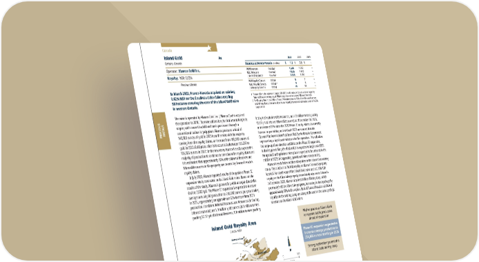 2022 ASSET HANDBOOK 76 FNV TSX NYSE N Meters 0 500 Island Gold Royalty Area 0.62% NSR Island East Northern Zone Island Main Island West FNV Royalty claims Reser ves + Resources 2021 2020 2019 Revenue to Franco-Nevada ($ million) $ 1.5 $ 0.8 $ – P&P Reserves (koz Au) 1 1,338 1,310 – M&I Resource (koz Au) 1 1,624 1,476 – Inferred Resource (koz Au) 1 3,454 3,208 – P&P Royalty Ounces (000s) 2 8 7 – M&I Royalty Ounces (000s) 1, 2 9 8 – Inf Royalty Ounces (000s) 2 19 18 – 1 Please refer to the tables on pages 128-136 for a breakout of grade and tonnages by Mineral Resource category; all M&I categories are inclusive of Mineral Reserves 2 For Royalty Ounce calculation, Franco-Nevada estimates 90% of the Mineral Reserves and Mineral Resources are subject to our royalty interest and estimates a rate of 0.62% is applicable Island Gold Au Ontario, Canada Operator: Alamos Gold Inc. Royalty: NSR: 0.62% Precious Metals In March 2020, Franco-Nevada acquired an existing 0.62% NSR on the Goudreau Lake claims totaling 58 hectares covering the core of the Island Gold mine in western Ontario. The mine is operated by Alamos Gold Inc. (“Alamos”) who acquired the operation in 2016. The mine utilizes longitudinal retreat longhole stoping with cement backfill and ore is processed through a conventional carbon in pulp plant. Alamos produced a total of 140,900 ounces of gold in 2021 from the mine with the majority coming from the royalty claims, an increase from 139,000 ounces of gold in 2020. Gold production is forecast to be between 125,000 to 135,000 ounces in 2022. In the near term, Franco-Nevada expects the majority of production to continue to come from the royalty claims and it is estimated that approximately 90% of the Mineral Reserves and Mineral Resources on the property are covered by Franco-Nevada’s royalty claims. In July 2020, Alamos reported results of the positive Phase III expansion study conducted on its Island Gold mine. Based on the results of the study, Alamos is proceeding with an expansion of the shaft to 2,000 tpd. The Phase III expansion is expected to increase average annual gold production to 236,000 ounces per year starting in 2025, representing an approximate 67% increase from 2021 production. Combined Mineral Reserves and Resources (including Inferred material) are 5.1 million gold ounces (4.1 million tonnes grading 10.12 g/t of Mineral Reserves, 1.1 million tonnes grading Canada Higher grades at Island Gold to support stable production ahead of expansion Phase III expansion expected to increase average production to 236,000 ounces starting in 2025 Strong exploration potential in Island Gold mining camp PRECIOUS METALS 8.12 g/t of exclusive M&I Resources, and 7.9 million tonnes grading 13.59 g/t of Inferred Mineral Resources) as of December 31, 2021, an increase of 37% since the 2020 Phase III study. Alamos is currently focused on permitting and in March 2022 announced that the Closure Plan Amendment had been filed by the Ontario Government representing a significant milestone for the operation. This will allow for ramp-up of construction activities on the Phase III expansion, including pre-sinking the shaft which is expected to begin mid-2022. An updated and optimized mine plan is expected to be released in the middle of 2022, incorporating growth and mine resequencing. Franco-Nevada holds additional royalties in the Island Gold mining camp. These include a 2% NSR royalty on Alamos’ Edwards property located 4 km north-east of the Island Gold mine and a 0.75% NSR royalty on the Cline Lake property immediately adjacent to Edwards. In December 2020, Alamos acquired Trillium Mining Corp. which previously held the Cline Lake property, increasing its land package by approximately 60% in the region. Both of Franco-Nevada’s additional royalties in the mining camp are along strike and on the same geologic structure as the Island Gold mine. Island Gold, Ontario
