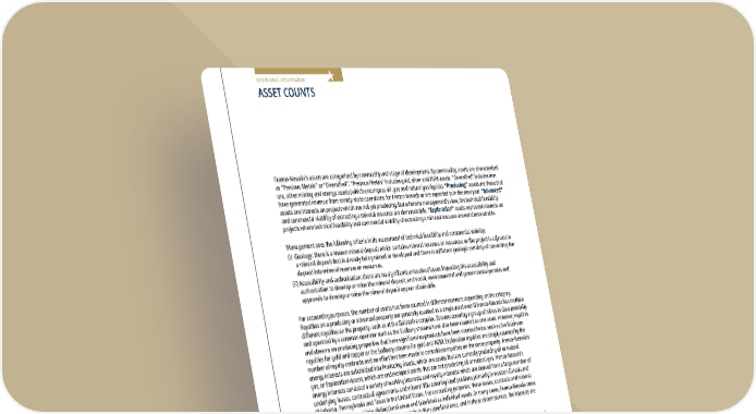 ASSET COUNTS Additional Information 138 FNV TSX NYSE ADDITIONAL INFORMATION 2022 ASSET HANDBOOK Franco-Nevada’s assets are categorized by commodity and stage of development. By commodity, assets are characterized as “Precious Metals” or “Diversified”. “Precious Metals” includes gold, silver and PGM assets. “Diversified” includes iron ore, other mining and energy assets (which encompass oil, gas and natural gas liquids). “Producing” assets are those that have generated revenue from steady-state operations for Franco-Nevada or are expected to in the next year. “Advanced” assets are interests on projects which are not yet producing, but where in management’s view, the technical feasibility and commercial viability of extracting a mineral resource are demonstrable. “Exploration” assets represent interests on projects where technical feasibility and commercial viability of extracting a mineral resource are not demonstrable. Management uses the following criteria in its assessment of technical feasibility and commercial viability: (i) Geology: there is a known mineral deposit which contains mineral reserves or resources; or the project is adjacent to a mineral deposit that is already being mined or developed and there is sufficient geologic certainty of converting the deposit into mineral reserves or resources. (ii) Accessibility and authorization: there are no significant unresolved issues impacting the accessibility and authorization to develop or mine the mineral deposit, and social, environmental and governmental permits and approvals to develop or mine the mineral deposit appear obtainable. For accounting purposes, the number of assets has been counted in different manners depending on the category. Royalties on a producing or advanced property are generally counted as a single asset even if Franco-Nevada has multiple different royalties on the property, such as at the Goldstrike complex. Streams covering a group of mines in close proximity and operated by a common operator such as the Sudbury streams have also been counted as one asset. However, royalties and streams on producing properties that have significant co-products have been counted twice, such as the Robinson royalties for gold and copper or the Sudbury streams for gold and PGM. Exploration royalties are simply counted by the number of royalty contracts and no effort has been made to consolidate royalties on the same property. Franco-Nevada’s energy interests are subdivided into Producing Assets, which are assets that are currently producing oil or natural gas, or Exploration Assets, which are undeveloped assets that are not producing oil or natural gas. Franco-Nevada’s energy interests consist of a variety of working interests and royalty interests which are derived from a large number of underlying leases, contractual agreements and mineral title covering land positions primarily in western Canada and Oklahoma, Pennsylvania and Texas in the United States. For accounting purposes, these leases, contracts and mineral title have been grouped into distinct land areas and tabulated as individual assets. In many cases, Franco-Nevada owns multiple royalties or working interests that pertain to the same land area, and in these circumstances, the interests are counted as a single asset. As of April 8, 2022, Franco-Nevada estimates that it holds 221 precious metals assets and 183 diversified assets for a total of 404 assets. Franco-Nevada Asset Counts at April 8, 2022 Precious Metals Diversified TOTAL Producing 45 67 1 112 Advanced 35 7 42 Exploration 141 109 2 250 TOTAL 221 183 404 1 12 Mining Assets/55 Energy Assets. 2 82 Mining Assets/27 Energy Assets.