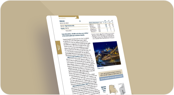 2022 ASSET HANDBOOK 90 FNV TSX NYSE PRECIOUS METALS 2021 2020 2019 Revenue to Franco-Nevada ($ million) $ 11.1 $ 9.6 $ 7.7 P&P Reserves (koz Au) 1 1,990 1,540 1,892 M&I Resource (koz Au) 1 3,950 4,160 4,373 Inferred Resource (koz Au) 1 610 500 749 P&P Royalty Ounces (000s) 2 37 29 35 M&I Royalty Ounces (000s) 1, 2 72 77 80 Inf Royalty Ounces (000s) 2 11 9 14 1 Please refer to the tables on pages 128-136 for a breakout of grade and tonnages by Mineral Resource category; all M&I categories are inclusive of Mineral Reserves 2 For Royalty Ounce calculation, Franco-Nevada estimates 93% (93% in 2020, 93% in 2019) of Mineral Reserves and 91% of the Mineral Resources (92% in 2019, 91% in 2019) are subject to our royalty interest and estimates a rate of 2.0% is applicable Duketon Au Australia, Rest of World Operator: Regis Resources Ltd. Royalty: NSR: 2% Precious Metals Franco-Nevada has a 2% NSR royalty that covers 2,678 km 2 of the Duketon gold project in Western Australia. The project is operated by Regis Resources Ltd. (“Regis”) and includes ten operating mines and six other deposits at various stages of development. The royalty covers all known Mineral Reserves and Mineral Resources, except for the Gloster, Ben Hur and Anchor satellite deposits and portions of the Erlistoun, Dogbolter and Petra satellite deposits. Regis reported production of 330,480 ounces of gold for 2021 and provided production guidance of 300,000 to 340,000 ounces of gold for the fiscal year ending June 30, 2022. During 2021, approximately 90% of total Duketon production was subject to Franco-Nevada’s royalty and a similar portion is expected in 2022. Duketon South Operations (“DSO”): Regis reported DSO production of 258,229 ounces of gold for calendar year 2021. All of DSO production was subject to Franco-Nevada’s royalty in 2021. DSO has five operating mines at Garden Well, Rosemont, Erlistoun, Tooheys Well and Banyego. Franco-Nevada’s royalty covers all of DSO’s Mineral Reserves and Mineral Resources, except for Ben Hur and a small portion of Erlistoun. DSO production began in 2012 at Garden Well which has a 5 Mt per annum plant. Rosemont has a 2.5 Mt per annum plant and milled ore from Rosemont is piped 10 km in a slurry form for leaching at Garden Well. Ore from satellite deposits at Erlistoun, Tooheys Well and Banyego is hauled to Garden Well for processing. Garden Well Underground development commenced in March 2021, with first production expected March 2022. In January 2022 heavy rains caused a pit wall failure and halted production at the Rosemont Main Pit, which had been due for completion in June 2022. Production at Rosemont Underground and Rosemont North Pit was not affected. Duketon North Operations (“DNO”): Regis reported DNO production of 72,251 ounces of gold for calendar year 2021. DNO has five operating mines at Moolart Well, Gloster, Dogbolter, Anchor and Petra. Moolart Well has been in production since 2010 and has a 2.5 Mt per annum plant. Moolart Well is covered by Franco-Nevada’s royalty, but has provided only a small portion of ore to the Moolart Well mill since 2016. The majority of ore processed through the Moolart Well plant since 2016 comes from four satellite deposits. Gloster and Anchor satellite deposits are not covered by Franco-Nevada’s royalty. Dogbolter and Petra satellite deposits are partially covered by Franco-Nevada’s royalty. Approximately 54% of DNO production was subject to Franco-Nevada’s royalty in 2021. Exploration: With an extensive land position and an active exploration program, Regis continues to add to the overall Mineral Reserves and Mineral Resources at Duketon. Significant exploration projects advanced in 2021 include resource extensions at Garden Well South and Rosemont Underground. Rest of World Garden Well Underground development commenced March 2021 with first production expected March 2022 Extensive land position and active exploration program Deposits Duketon Royalty Area 2% NSR Km 0 30 Location M ap PERTH Por t Hedland Kalgoorlie Norseman Kambalda Baneygo Erlistoun King John Garden Well Dogbolter Gloster Moolart Well Petra Rosemont Reichelts Find Current Royalty Tenements Original Royalty Tenements * Additional royalty lands to south not shown due to scale. N Russells Find Tooheys Well Duketon, Australia