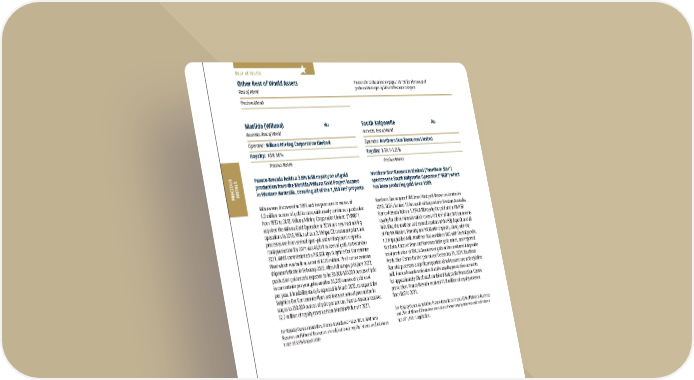 2022 ASSET HANDBOOK 92 FNV TSX NYSE PRECIOUS METALS Rest of World Franco-Nevada holds a 3.6% NSR royalty on all gold production from the Matilda/Wiluna Gold Project located in Western Australia, covering all of the 1,150 km 2 property. Wiluna was discovered in 1896 and has produced in excess of 4.0 million ounces of gold to date, with nearly continuous production from 1987 to 2013. Wiluna Mining Corporation Limited (“WMX”) acquired the Wiluna Gold Operation in 2014 and resumed mining operations in 2016. Wiluna has a 2.1 Mtpa CIL treatment plant and processes ore from several open-pit and underground deposits. Total production for 2021 was 40,879 ounces of gold. In December 2021, WMX commissioned a 750,000 tpa Sulphide Ore Concentrate Plant which was built at a cost of A$26 million. The first concentr ate shipment left site in February 2022. After full ramp-up in June 2022, production guidance is expected to be 90,000-100,000 ounces of gold in concentrate per year, plus another 20,000 ounces of gold doré per year. A feasibility study is expected in March 2022, to expand the Sulphide Ore Concentrate Plant and increase annual production in stages to 250,000 ounces of gold per annum. Franco-Nevada received $2.7 million of royalty revenue from Matilda/Wiluna in 2021. For Royalty Ounce calculation, Franco-Nevada estimates 100% of Mineral Reserves and Mineral Resources are subject to our royalty interest and estimates a rate of 3.6% is applicable Matilda (Wiluna) Au Australia, Rest of World Operator: Wiluna Mining Corporation Limited Royalty: NSR: 3.6% Precious Metals Northern Star Resources Limited (“Northern Star”) operates the South Kalgoorlie Operation (“SKO”) which has been producing gold since 1989. Northern Star acquired SKO from Westgold Resources Limited in 2018. SKO is located 15 km south of Kalgoorlie in Western Australia. Franco-Nevada holds a 1.75% NSR royalty for gold and a 1% NSR royalty for other minerals which covers 470 km 2 of the SKO tenements including the northern and central sections of the HBJ deposit and all of the Mt Marion, Pernatty and Mt Martin deposits, along with the 1.2 Mtpa Jubilee Mill. Northern Star combines SKO with the Kalgoorlie, Kundana, Carosue Dam and Kanowna Belle gold mines, and reported total production of 984,540 ounces of gold at the combined Kalgoorlie Production Centre for the year ended December 31, 2021. Northern Star also processes a significant portion of toll-treated ore at the Jubilee mill. Franco-Nevada estimates that the royalty production accounts for approximately 6% of total combined Kalgoorlie Production Centre production. Franco-Nevada received $1.8 million of royalty revenue from SKO in 2021. For Royalty Ounce calculation, Franco-Nevada estimates 82% of Mineral Reserves and 75% of Mineral Resources are subject to our royalty interest and estimates a rate of 1.75% is applicable. South Kalgoorlie Au Australia, Rest of World Operator: Northern Star Resources Limited Royalty: NSR: 1-1.75% Precious Metals Other Rest of World Assets Rest of World Precious Metals Please refer to the tables on pages 128-136 for a breakout of grade and tonnages by Mineral Resource category.