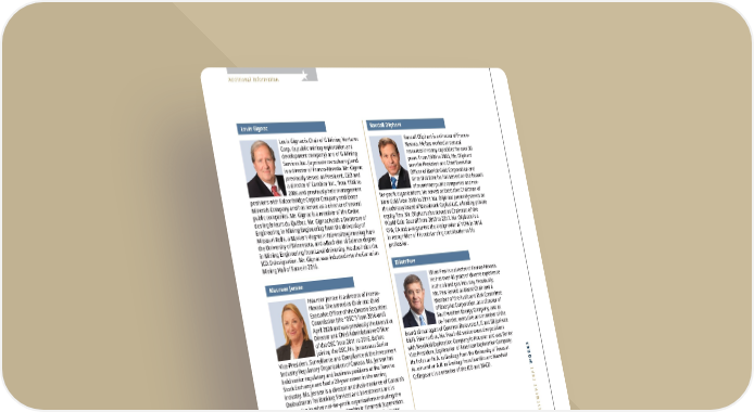 FRANCO-NEVADA CORPORATION 143 Additional Information Louis Gignac Louis Gignac is Chair of G Mining Ventures Corp. (a public mining exploration and development company) and of G Mining Services Inc. (a private consultancy) and is a director of Franco-Nevada. Mr. Gignac previously served as President, CEO and a director of Cambior Inc., from 1986 to 2006 and previously held management positions with Falconbridge Copper Company and Exxon Minerals Company and has served as a director of several public companies. Mr. Gignac is a member of the Ordre des ingénieurs du Québec. Mr. Gignac holds a Doctorate of Engineering in Mining Engineering from the University of Missouri Rolla, a Master’s degree in Mineral Engineering from the University of Minnesota, and a Bachelor of Science degree in Mining Engineering from Laval University. He also holds the ICD.D designation. Mr. Gignac was inducted into the Canadian Mining Hall of Fame in 2016. Maureen Jensen Maureen Jensen is a director of Franco- Nevada. She served as Chair and Chief Executive Officer of the Ontario Securities Commission (the “OSC”) from 2016 until April 2020 and was previously the Executive Director and Chief Administrative Officer of the OSC from 2011 to 2016. Before joining the OSC, Ms. Jensen was Senior Vice-President, Surveillance and Compliance at the Investment Industry Regulatory Organization of Canada. Ms. Jensen has held senior regulatory and business positions at the Toronto Stock Exchange and had a 20-year career in the mining industry. Ms. Jensen is a director and chair-nominee of Canada’s Ombudsman for Banking Services and Investments and is also active in other not-for-profit organizations including the Toronto Centre for Global Leadership in Financial Supervision, as Chair of The Prosperity Project and as a Public Governor of FINRA in the United States. Ms. Jensen is a Registered Professional Geoscientist (PGO), holds the ICD.D designation, has a BSc, Doctor of Laws (Honoris Causa) and is a member of the Investment Industry Hall of Fame. Jennifer Maki Jennifer Maki is a director of Franco- Nevada. She is also a director of Baytex Energy Corp. and Pan American Silver Corp. She previously served as Chief Executive Officer of Vale Canada and Executive Director of Vale Base Metals (2014 to 2017) and previously held several other positions with Vale Base Metals, including Chief Financial Officer & Executive Vice-President and Vice-President & Treasurer. She has also served on the boards of not-for-profit organizations. Ms. Maki has a Bachelor of Commerce degree from Queen’s University and a postgraduate diploma from the Institute of Chartered Accountants, both in Ontario, Canada. She also holds the ICD.D designation. Randall Oliphant Randall Oliphant is a director of Franco- Nevada. He has worked in natural resources in many capacities for over 30 years. From 1999 to 2003, Mr. Oliphant was the President and Chief Executive Officer of Barrick Gold Corporation and since that time he has served on the boards of numerous public companies and not- for-profit organizations. He served as Executive Chairman of New Gold from 2009 to 2017. Mr. Oliphant presently serves on the advisory board of Metalmark Capital LLC, a leading private equity firm. Mr. Oliphant also served as Chairman of the World Gold Council from 2013 to 2017. Mr. Oliphant is a CPA, CA and was granted the designation of FCPA in 2016 in recognition of his outstanding contribution to his profession. Elliott Pew Elliott Pew is a director of Franco-Nevada. He has over 40 years of diverse experience in the oil and gas industry. Previously, Mr. Pew served as Board Chair and a Member of the Audit and Risk Committee of Enerplus Corporation, as a director of Southwestern Energy Company, and as co-founder, executive and member of the board of managers of Common Resources I, II and III (private E&P). Prior to that, Mr. Pew held senior executive positions with Newfield Exploration Company in Houston and was Senior Vice President, Exploration of American Exploration Company. He holds an M.A. in Geology from the University of Texas at Austin and an A.B. in Geology from Franklin and Marshall College and is a member of the ICD and NACD. ADDITIONAL INFORMATION THE GOLD INVESTMENT THAT WORKS