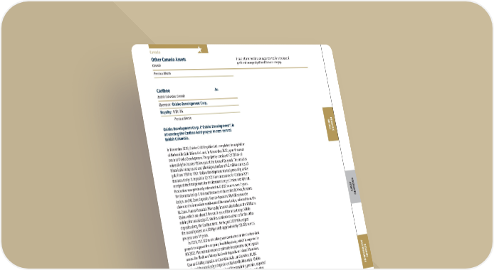 FRANCO-NEVADA CORPORATION 83 THE GOLD INVESTMENT THAT WORKS Canada Other Canada Assets Canada Precious Metals Please refer to the tables on pages 128-136 for a breakout of grade and tonnages by Mineral Resource category. Osisko Development Corp. (“Osisko Development”) is advancing the Cariboo Gold project in east-central British Columbia. In November 2019, Osisko Gold Royalties Ltd. completed its acquisition of Barkerville Gold Mines Ltd. and, in November 2020, spun the asset out into Osisko Development. The property consists of 2,120 km 2 of mineral rights located 85 km east of the town of Quesnel. The area has historical underground and alluvial production of 4.5 million ounces of gold from 1933 to 1967. Osisko Development started producing at the Bonanza Ledge II deposit in Q2 2021 and announced in October 2021 receipt of the final permits for the Bonanza Ledge II mine and QR mill. Production was previously estimated at 62,000 ounces over 2 years. The Bonanza Ledge II Mineral Resource includes the BC Vein, Bonanza Ledge, and KL Zone deposits. Franco-Nevada’s 3% NSR covers the claims to the immediate north-east of Bonanza Ledge, referred to as the KL Zone. Franco-Nevada’s 3% royalty interest also includes the Williams Claims which are about 5 km south east of Bonanza Ledge. While mining Bonanza Ledge II, studies continue to advance for the other deposits along the Cariboo trend. An August 2019 PEA scoped the overall project at 4,000 tpd with approximately 200,000 ounces per year over 11 years. In 2021, 152,500 m of drilling was conducted on the Cariboo Gold project to support the ongoing feasibility study, which is expected in H1 2022. The mineral resource estimate incorporates eight deposit areas: the Shaft and Mosquito Creek deposits on Island Mountain, Cow and Valley deposits on Cow Mountain, and Lowhee, KL, BC Vein and Bonanza Ledge deposits on Barkerville Mountain. Osisko Development is waiting for receipt of the remaining permits, expected in Q3 2022, before starting construction at Cariboo, with production anticipated to start in 2023. An updated reserve and resource estimate at Cariboo and a feasibility study with full reserve and mine plan are expected in Q2 2022. Osisko Development has stated the EA Certificate is still on schedule for August/September of 2022. Franco-Nevada has not included Cariboo in Royalty Ounce estimates Cariboo Au British Columbia, Canada Operator: Osisko Development Corp. Royalty: NSR: 3% Precious Metals PRECIOUS METALS DIVERSIFIED ASSETS RESERVES AND RESOURCES ADDITIONAL INFORMATION