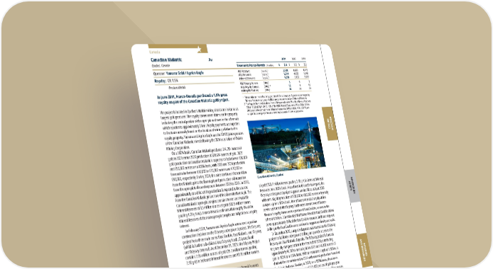 FRANCO-NEVADA CORPORATION 75 THE GOLD INVESTMENT THAT WORKS Canada PRECIOUS METALS DIVERSIFIED ASSETS RESERVES AND RESOURCES ADDITIONAL INFORMATION 2021 2020 2019 Revenue to Franco-Nevada ($ million) $ 2.4 $ 3.1 $ 2.2 P&P Reserves (koz Au) 1 3,534 4,428 4,778 M&I Resource (koz Au) 1 5,214 4,638 5,640 Inferred Resource (koz Au) 1 6,236 6,602 2,922 P&P Royalty Ounces (000s) 2 5 6 9 M&I Royalty Ounces (000s) 1, 2 13 6 10 Inf Royalty Ounces (000s) 2 32 34 21 1 Please refer to the tables on pages 128-136 for a breakout of grade and tonnages by Mineral Resource category; all M&I categories are inclusive of Mineral Reserves 2 For Royalty Ounce calculation, Franco-Nevada estimates 9% of the Mineral Reserves (9% in 2020, 12% in 2019), 16% of the M&I Mineral Resources (9% in 2020, 12% in 2019) and 34% of the Inferred Mineral Resources (34% in 2020, 48% in 2019) are subject to our royalty interest and estimates a rate of 1.5% is applicable Canadian Malartic Au Quebec, Canada Operator: Yamana Gold / Agnico Eagle Royalty: GR: 1.5% Precious Metals In June 2011, Franco-Nevada purchased a 1.5% gross royalty on part of the Canadian Malartic gold project. The project is located in Quebec’s Abitibi mining district and is Canada’s largest gold producer. The royalty covers seven claims on the property including the central portion of the open pit as shown in the schematic which equates to approximately 3 km 2 . Royalty payments are expected to fluctuate annually based on the location of mining relative to the royalty property. Yamana and Agnico Eagle are the 50/50 joint operators of the Canadian Malartic mine following the 2014 acquisition of Osisko Mining Corporation. On a 100% basis, Canadian Malartic produced 714,784 ounces of gold in 2021 versus 2020 production of 568,634 ounces of gold. 2022 gold production at Canadian Malartic is expected to be between 630,000 and 650,000 ounces on a 100% basis, with 2023 and 2024 production forecast to be between 650,000 to 670,000 ounces and 670,000 to 690,000, respectively. During 2021, the mine continued the transition from the Malartic pit to the Barnat pit and production will transition from the open pit to the underground between 2023 to 2029. In 2022, approximately one-third of the production is expected to be sourced from the Canadian Malartic pit and two-thirds from the Barnat pit. The Canadian Malartic open-pit complex contains Proven and Probable Mineral Reserves of 3.5 million ounces of gold (100.5 million tonnes grading 1.09 g/t Au). Franco-Nevada estimates that roughly 9% of the Mineral Reserves of the main open-pit complex are subject to our royalty interest. In February 2021, Yamana and Agnico Eagle announced a positive construction decision on the Odyssey underground project. The Odyssey project hosts three main zones: East Gouldie, East Malartic, and Odyssey (which is further sub-divided into Odyssey North, Odyssey South and Odyssey Internal). As of December 31, 2021, the Odyssey Project contains 2.35 million ounces of gold (25.2 million tonnes grading 2.90 g/t) in Indicated Mineral Resources and 13.15 million ounces Canada’s largest gold producer and long-life asset Open pit and underground exploration targets present additional potential ore sources Mill Malartic (town site) Hwy 117 deviation Canadian Malartic Royalty Area 1.5% Royalty Claims Quartz Veins Mineralized Envelopes Open Pit East Gouldie Barnat Pit Canadian Malartic Pit East Malartic Sladen Jeffrey Pit Sheehan Odyssey Jupiter Odyssey South Odyssey North Rail line Rail line Latest 2021 ‘C’ version 1 0 Km N Gouldie Canadian Malartic Quebec Ontario of gold (173.7 million tonnes grading 2.35 g/t) in Inferred Mineral Resources on a 100% basis. As outlined in this technical report, the Odyssey underground project supports a mine life to at least 2039 with annual gold production of 500,000 to 600,000 ounces when fully ramped up on a 100% basis. One of Franco-Nevada’s royalty claims covers a portion of the Odyssey South extension and two of Franco- Nevada’s royalty claims cover a portion of East Gouldie, as seen in the schematic below. It is estimated that Franco-Nevada’s East Gouldie claims cover approximately 35% of the East Gouldie resource. Infill and step-out drilling at the East Gouldie zone continue to support continuity and scale. In December 2020, ramp development was started on the Odyssey project to facilitate underground drilling and provide access to the Odyssey and East Malartic deposits. The Odyssey project is forecast to gradually start production in the first half of 2023,contributing approximately 46,000 ounces of gold in 2023 and 76,000 ounces of gold in 2024 on a 100% basis. With an estimated depth of 1,800 m, a shaft will be commissioned in 2027 with modest production from East Gouldie in that year. Starting in 2029, on a 100% basis, the mine is expected to produce an average of 545,400 ounces of gold per year with gold production expected to be approximately 6.9 million ounces over a 17-year mine life. Canadian Malarctic, Quebec