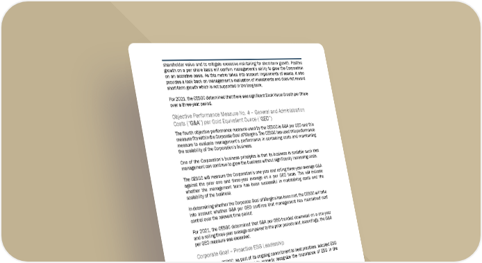 6 6 1 shareholder value and to mitigate excessive risk-taking for short-term growth. Positive growth on a per share basis will confirm management’s ability to grow the Corporation on an accretive basis. As this metric takes into account impairments of assets, it also provides a look back on management’s eval uation of investments and does not reward short-term growth which is not supported in the long-term. For 2021, the CESGC determined that there was significant Book Value Growth per Share over a three-year period. Objective Performance Measure No. 4 – General and Administration Costs (“ G & A ”) per Gold Equivalent Ounce (“G G E O ”) The fourth objective performance measure used by the CESGC is G&A per GEO and this measure fits within the Corporate Goal of Margins. The CESGC has used this performance measure to evaluate management’s performance in containing costs and maintaining the scalability of the Corporation’s business. One of the Corporation’s business principles is that its business is scalable such that management can continue to grow the business without significantly increasing costs. The CESGC will measure the Corporation’s one-year and rolling three-year average G&A against the prior one and three-year average on a per GEO basis. This will indicate whether the management team has been successful in maintaining costs and the scalability of the business. In determining whether the Corporate Goal of Margins has been met, the CESGC will take into account whether G&A per GEO confirms that management has maintained cost control over the relevant time period. For 2021, the CESGC determined that G&A per GEO trended downward on a one-year and a rolling three-year average compared to the prior periods and, accordingly, the G&A per GEO measure was exceeded. Corporate Goal – Proactive ESG Leadership In 2020, the CESGC, as part of its ongoing commitment to best practices, adopted ESG as a standalone corporate goal to properly recognize the importance of ESG in the Corporation’s long-term strategy and success. In adding ESG as a standalone corporate goal, the CESGC determined that (i) “Proactive ESG Leadership” would be the key principle guiding the Corporate Goal and (ii) the CESGC would focus on five ESG objectives when evaluating management’s performance for compensation decisions. The CESGC believes that these five objectives are focused on the key ESG issues for the Corporation and strike the appropriate balance of subjective and measurable goals which are both backward and forward-looking. The table below sets out the five ESG objectives along with th e rationale for each objective and the factors the CESGC will consider when evaluating management’s performance. For 2021, the CESGC determined that significant achievements were accomplished by the Named Executive Officers and the Corpor ate Goal of Proactive ESG Leadership was exceeded.
