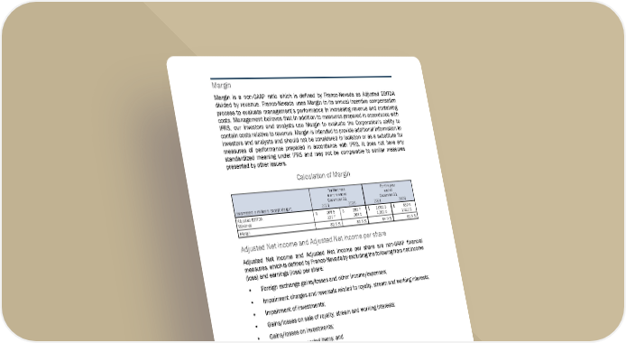 9 9 7 Margin Margin is a non-GAAP ratio which is defined by Franco-Nevada as Adjusted EBITDA divided by revenue. Franco-Nevada uses Margin in its annual incentive compensation process to evaluate management’s performance in increasing revenue and containing costs. Management believes that in addition to measures prepared in accordance with IFRS, our investors and analysts use Margin to evaluate the Corporation’s ability to contain costs relative to revenue. Margin is intended to provide additional information to investors and analysts and should not be considered in isolation or as a substitute for measures of performance prepared in acco rdance with IFRS. It does not have any standardized meaning under IFRS and may not be comparable to similar measures presented by other issuers. Calculation of Margin For the three For the year months ended ended December 31, December 31, (expressed in millions, except Margin) 2021 2020 2021 2020 Adjusted EBITDA $ 269.8 $ 253.7 $ 1,092.3 $ 839.6 Revenue 327.7 304.5 1,300.0 1,020.2 Margin 82.3 % 83.3 % 84.0 % 82.3 % Adjusted Net Income and Adjusted Net Income per share Adjusted Net Income and Adjusted Net Income per share are non-GAAP financial measures, which is defined by Franco-Nevada by excluding the following from net income (loss) and earnings (loss) per share: • Foreign exchange gains/losses and other income/expenses; • Impairment charges and reversals related to royalty, stream and working interests; • Impairment of investments; • Gains/losses on sale of royalty, stream and working interests; • Gains/losses on investments; • Unusual non-recurring items; and • Impact of income taxes on these items. Management uses Adjusted Net Income and Ad justed Net Income per share to evaluate the underlying operating performance of Franco-Nevada as a whole for the reporting periods presented, to assist with the planning and forecasting of future operating results and to supplement information in its financial statements. Management believes that in addition to measures prepared in accordance with IFRS such as Net Income and EPS, our investors and analysts use Adjusted Net Income and Adjusted Net Income per share to evaluate the results of the underlying business of Franco-Nevada, particularly since the excluded items are typically not included in our guidance. While the adjustments to net income and EPS in these measures include items that are both recurring and non- recurring, management believes that Adjusted Net Income and Adjusted Net Income per share are useful measures of Franco-Nevad a’s performance because they adjust for items which may not relate to or have a disproportionate effect on the period in which