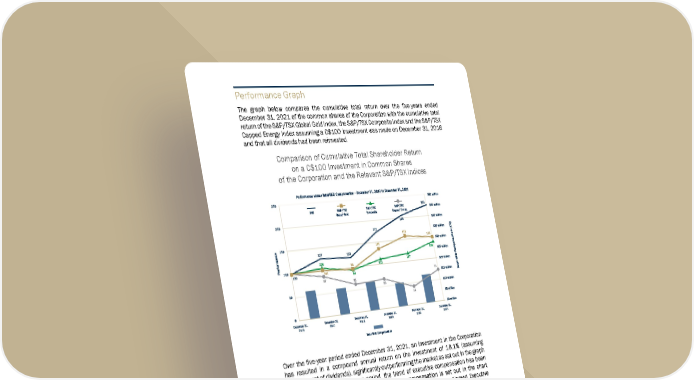 7 7 0 Performance Graph The graph below compares the cumulative total return over the five years ended December 31, 2021 of the common shares of the Corporation with the cumulative total return of the S&P/TSX Global Gold Index, the S&P/TSX Composite Index and the S&P/TSX Capped Energy Index assuming a C$100 inve stment was made on December 31, 2016 and that all dividends had been reinvested. Comparison of Cumulative Total Shareholder Return on a C$100 Investment in Common Shares of the Corporation and the Relevant S&P/TSX Indices Over the five-year period ended December 31, 2021, an investment in the Corporation has resulted in a compound annual return on the investment of 18.1% (assuming reinvestment of dividends), significantly outperforming the market as set out in the graph above. Over the same five-year period, the trend of executive compensation has been relatively stable. Total Named Executive Officer compensation is set out in the chart above illustrating the total amount of compensation awarded to the Named Executive Officers as reported in the Corporation’s management information circular for each relevant year.