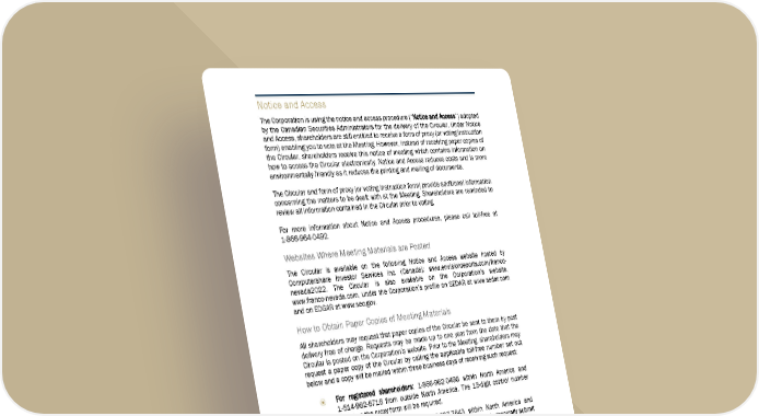 Notice and Access The Corporation is using the notice and access procedure (“N N o t i c e a n d A c c e s s ”) adopted by the Canadian Securities Administrators for the delivery of the Circular. Under Notice and Access, shareholders are still entitled to receive a form of proxy (or voting instruction form) enabling you to vote at the Meeting. However, instead of receiving paper copies of the Circular, shareholders receive this notice of meeting which contains information on how to access the Circular electronically. No tice and Access reduces costs and is more environmentally friendly as it reduces the printing and mailing of documents. The Circular and form of proxy (or voting in struction form) provide additional information concerning the matters to be dealt with at the Meeting. Shareholders are reminded to review all information contained in the Circular prior to voting. For more information about Notice and Acce ss procedures, please call toll-free at 1-866-964-0492. Websites Where Meeting Materials are Posted The Circular is available on the following Notice and Access website hosted by Computershare Investor Services Inc. (C anada): www.envisionreports.com/franco- nevada2022. The Circular is also available on the Corporation’s website, www.franco-nevada.com, under the Corporation’s profile on SEDAR at www.sedar.com and on EDGAR at www.sec.gov. How to Obtain Paper Copies of Meeting Materials All shareholders may request that paper copies of the Circular be sent to them by post delivery free of charge. Requests may be made up to one year from the date that the Circular is posted on the Corporation’s website. Prior to the Meeting, shareholders may request a paper copy of the Circular by calling the applicable toll-free number set out below and a copy will be mailed within three business days of receiving such request: F o r r e g i s t e r e d s h a r e h o l d e r s : 1-866-962-0498 within North America and 1-514-982-8716 from outside North Am erica. The 15-digit control numbe r found on the proxy form will be required. F o r b b e n e f i c i a l s h a r e h o l d e r s : 1-877-907-7643 within North America and 1-303-562-9305 from outside North Amer ica or you may electronically submit a request at www.proxyvote.com. The 16-digit control number found on the voting instruction form will be required. If a shareholder wishes to receive the Circular prior to the voting deadline as described below, the request should be made before 5: 00 p.m. (Toronto time) on April 20, 2022. After the Meeting, shareholders may request a paper copy of the Circular by calling 1-844-916-0609 within North America and 1- 303-562-9305 from outside North America and a copy will be mailed within ten calendar days of receiving such request.