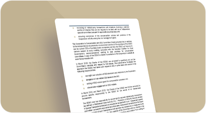 3 3 3 reviewing all related-party transactions and situations involving a potential conflict of interest that are not required to be dealt with by an independen t special committee pursuant to applicable securities laws; and ensuring compliance of the compensa tion policies and practices of the Corporation with its enterprise risk management goals. The Corporation’s Compensation and ESG Commi ttee Charter provides that, in addition to the independence requirements, no more than one-third of the members of the CESGC can be current CEOs of publicly-traded companies and that the CESGC will have an in- camera session at every meeting, consistent with the Canadian Coalition for Good Governance’s recommendations relating to best practices for compensation committees. A copy of the CESGC’s Charter is available on the Corporation’s website at www.franco-nevada.com. In March 2020, the Charter of the CESGC was amended to specifically set out the Committee’s mandate with respect to ESG issues. The amendments formalized the approach the CESGC had taken with respect to ESG in prior years and consist of the following responsibilities: oversight over adoption of ESG standard s and initiatives by the Corporation; delegation of risk-related ESG issues to the ARC; setting of ESG-related goals for compensation purposes; and shareholder engagement on ESG matters. In March 2021 and March 2022, the Charter of the CESGC was further amended to provide specific responsibility to the CE SGC for the review of all related-party transactions. The CESGC now has responsibility for reviewin g all proposed related-party transactions (as defined in Multilateral Instrument 61-101 – Protection of Minority Security Holders in Special Transactions ) that are not required to be dealt with by an “independent special committee” pursuant to applicable securities laws, make recommendations to the Board for the approval of such transactions and approve any procedures or measures to be adopted in connection therewith. Any member of the Committee with an interest in the proposed transaction and the non-independen t directors must abstain from voting on the proposed transaction. Position Descriptions The Board has developed and approved written position descriptions for the Chair of the Board, the Lead Independent Director, the Chair of the ARC, the Chair of the CESGC and for the CEO. Orientation and Continuing Education The Corporation provides an orientation progra m for new directors in order that they can become familiar with the role of the Board, its committees and its directors and with the nature and operation of the Corporation’s business. All Board members are provided with a copy of the written mandate and charters for the Board and each of its committees and