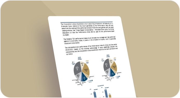 5 5 9 The Corporation’s total shareholder return (a ssuming reinvestment of dividends) on a three-year basis relative to the return generated by the Performance Index will also determine the vesting of the performance-based RSUs that were granted with the same vesting window. See “Share Based Compensati on – Restricted Share Units” for further discussion on how the Performance Index will be used for the performance-based multiplier. The Relative TSR performance measure will indicate how management has performed against (i) commodity prices, (ii) peers in the allocation of capital, and (iii) generalist investment alternatives. The composition and performance of the Performance Index for 2021 and the period 2018-2021 (based on the existing method ology of equal weig htings between the components) and the Corporation’s total shareh older return for the same periods are set out below: For the three-year period from December 11, 2018 to December 11, 2021 (corresponding to the three-year period from grant date), Franco-Nevada’s total shareholder return was 89.1% compared to Performance Index performance of 64.6%. This outperformance of 24.5% resulted in a 1.98 times multiplier being applicable to the performance-based RSUs which vested in 2021.