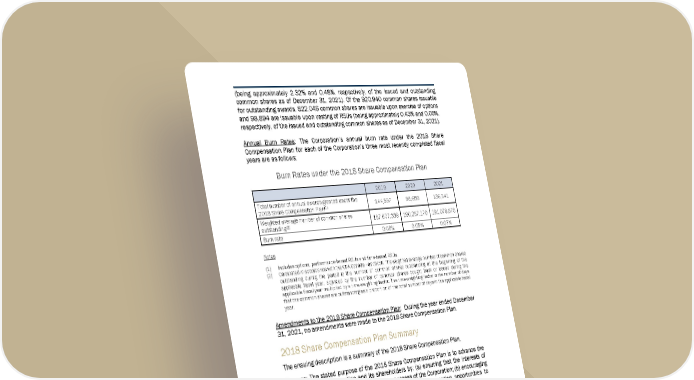 8 8 4 (being approximately 2.32% and 0.48%, resp ectively, of the issued and outstanding common shares as of December 31, 2021). Of the 920,940 common shares issuable for outstanding awards, 822,046 common shares are issuable upon exercise of options and 98,894 are issuable upon vesting of RS Us (being approximat ely 0.43% and 0.05%, respectively, of the issued and outstanding common shares as of December 31, 2021). Annual Burn Rates: The Corporation’s annual burn rate under the 2018 Share Compensation Plan for each of the Corporat ion’s three most recently completed fiscal years are as follows: Burn Rates under the 2018 Share Compensation Plan 2019 2020 2021 Total number of annual awards granted under the 2018 Share Compensation Plan (1) 144,897 98,659 136,341 Weighted average number of common shares outstanding (2) 187,677,339 190,287,170 191,078,878 Burn rate 0.08% 0.05% 0.07% Notes (1) Includes options, performance-based RSUs and time-based RSUs. (2) Calculated in accordance with the CPA Canada Handbook: The weighted average number of common shares outstanding during the period is the number of common shares outstanding at the beginning of the applicable fiscal year, adjusted by the number of common shares bought back or issued during the applicable fiscal year multiplied by a time-weighting factor. The time-weighting factor is the number of days that the common shares are outstanding as a proportion of the total number of days in the applicable fiscal year. Amendments to the 2018 Share Compensation Plan: During the year ended December 31, 2021, no amendments were made to the 2018 Share Compensation Plan. 2018 Share Compensation Plan Summary The ensuing description is a summary of the 2018 Share Compensation Plan. Purpose: The stated purpose of the 2018 Sh are Compensation Plan is to advance the interests of the Corporation and its shareholders by: (a) ensuring that the interests of officers and employees are aligned with the success of the Corporation; (b) encouraging stock ownership by such persons; and (c) providing compensation opportunities to attract, retain and motivate such persons. Participants: Each officer and employee of the Corporation and its subsidiaries is eligible to participate in the 2018 Share Compensation Plan. Non-employee directors of the Corporation are not eligible to participat e in the 2018 Share Compensation Plan in respect of RSUs. Under the 2018 Share Comp ensation Plan, non-employee directors of the Corporation are eligible to participate in respect of options, however, only on a limited basis consistent with the guidelines of certain governance rating agencies. See “Restriction on the Award of RSUs and Gr ant of Options” in this section below.