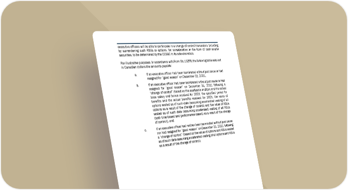 8 8 1 executive officers will be able to participate in a change of control transaction, including by surrendering such RSUs or options, for consideration in the form of cash and/or securities, to be determined by th e CESGC in its sole discretion. For illustrative purposes, in accordance with Form 51-102F6, the following table sets out in Canadian dollars the amounts payable: a. if an executive officer had been terminated without just cause or had resigned for “good reason” on December 31, 2021, b. if an executive officer had been terminated without just cause or had resigned for “good reason” on December 31, 2021 following a “change of control” (based on the applicable multiple and the actual base salary and bonus received for 2021, the specified period for benefits and the actual benefits received for 2021, the value of options vested as of such date (a ssuming accelerated vesting of all options as a result of the change of control) and the value of RSUs vested as of such date (assuming accelerated vesting of all RSUs (both time-based and performance-ba sed) as a result of the change of control)), and c. if an executive officer had neither been terminated without just cause nor had resigned for “good reason” on December 31, 2021 following a “change of control” (based on the value of options and RSUs vested as of such date assuming accelera ted vesting of all options and RSUs as a result of the change of control).