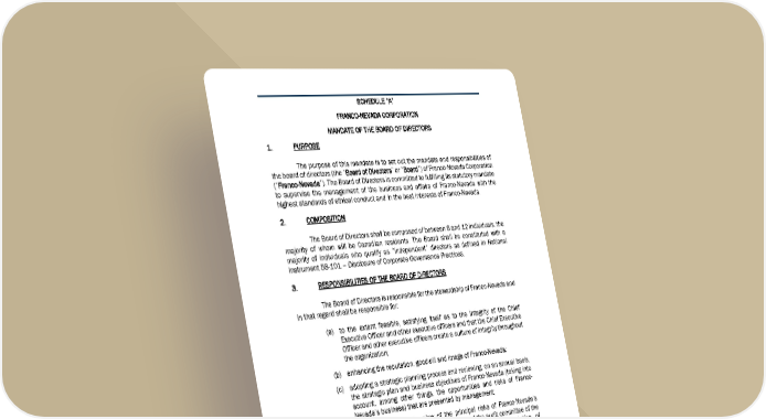 9 9 1 S C H E D U L E “ A ” F R A N C O - N E V A D A C O R P O R A T I O N M A N D A T E O F T H E B O A R D O F D I R E C T O R S 1 . P U R P O S E The purpose of this mandate is to set out the mandate and responsibilities of the board of directors (the “ B o a r d o f D i r e c t o r s ” or “B B o a r d ”) of Franco-Nevada Corporation (“ F r a n c o - N e v a d a ”). The Board of Directors is committed to fulfilling its statutory mandate to supervise the management of the busine ss and affairs of Franco-Nevada with the highest standards of ethical conduct and in the best interests of Franco-Nevada. 2 . C O M P O S I T I O N The Board of Directors shall be composed of between 6 and 12 individuals, the majority of whom will be Canadian residents. The Board shall be constituted with a majority of individuals who qualify as “independent” directors as defined in National Instrument 58-101 – Disclosure of Corporate Governance Practices. 3 . R E S P O N S I B I L I T I E S O F T H E B O A R D O F D I R E C T O R S The Board of Directors is responsible for the stewardship of Franco-Nevada and in that regard shall be responsible for: (a) to the extent feasible, satisfying itself as to the integrity of the Chief Executive Officer and other executive o fficers and that the Chief Executive Officer and other executive officers create a culture of integrity throughout the organization; (b) enhancing the reputation, goodwill and image of Franco-Nevada; (c) adopting a strategic planning process and reviewing, on an annual basis, the strategic plan and business object ives of Franco-Nevada (taking into account, among other things, the opportunities and risks of Franco- Nevada’s business) that are presented by management; (d) the identification and review of the principal risks of Franco-Nevada’s business and ensuring, with the assi stance of the audit committee of the Board (the “Audit and Risk Committee”), the implementation of appropriate risk management systems; (e) ensuring, with the assistance of the Compensation and ESG Committee of the Board (the “Compensation and ESG Committee”), the effective functioning of the Board of Director s and its committees in compliance with the corporate governance requirements of applicable laws, and that such compliance is reviewed periodic ally by the Compensation and ESG Committee;