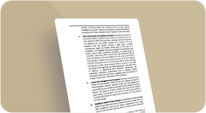 9 9 3 interests of Franco-Nevada take pr ecedence over any other interest possessed by a director. Directors are expected to conduct themselves in accordance with Franco-Nevada’s Co de of Business Conduct and Ethics. (e) O t h e r D i r e c t o r s h i p s a n d S i g n i f i c a n t A c t i v i t i e s . Franco-Nevada values the experience directors bring from othe r boards on which they serve and other activities in which they participate, but recognizes that those boards and activities also may present demands on a director’s time and availability and may present conflicts or legal issues, including independence issues. No director should serve on the board of a competitor or of a regulatory body wi th oversight of Franco-Nevada. Each director should, when considering membership on another board or committee, make every effort to ensure that such membership will not impair the director’s time and availability for his or her commitment to Franco-Nevada. Directors should advi se the chair of the Compensation and ESG Committee and the Chief Executive Officer before accepting membership on other public company boards of directors or any audit committee or other significant committee assignment on any other board of directors, or establishing ot her significant relationships with businesses, institutions, government al units or regulatory entities, particularly those that may result in significant time commitments or a change in the director’s re lationship to Franco-Nevada. (f) C o n t a c t w i t h M a n a g e m e n t a n d E m p l o y e e s . All directors should be free to contact the Chief Executive Officer at any time to discuss any aspect of Franco-Nevada’s business. Directors should use their judgement to ensure that any such contact is not disruptive to the operations of Franco- Nevada. The Board of Directors expects that there will be frequent opportunities for directors to meet with the Chief Executive Officer in meetings of the Board of Directors and committees, or in other formal or informal settings. (g) S p e a k i n g o n B e h a l f o f F r a n c o - N e v a d a . It is important that Franco-Nevada speak to employees and outside consti tuencies with a single voice, and that management serve as the primary spokesperson. As a result, directors should ensure that they ad here to Franco-Nevada’s disclosure policy. (h) C o n f i d e n t i a l i t y . The proceedings and deliberations of the Board of Directors and its committees are confid ential. Each director will maintain the confidentiality of information received in connection with his or her service as a director.