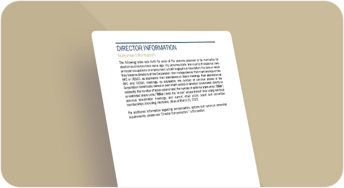 1 1 0 DIRECTOR INFORMATION Nominee Information The following table sets forth for each of the persons proposed to be nominated for election as directors their name, age, city, province/state, and country of residence; their principal occupations or employment; a brief bi ographical description; the date on which they became directors of the Corporation; their independence; their memberships on the ARC or CESGC, as applicable; their attendance at Board meetings; their attendance at ARC and CESGC meetings, as applicable; the number of common shares of the Corporation beneficially owned or over which co ntrol or direction is exercised, directly or indirectly; the number of stock options he ld; the number of deferred share units (“ D D S U s ”) or restricted share units (“ R S U s ”) held; the “at-risk” values thereof; their voting results at previous shareholder meetings; and current other public board and committee memberships (including interlocks), all as at March 21, 2022. For additional information regarding compensation, options and minimum ownership requirements, please see “Director Compensation” in this section.