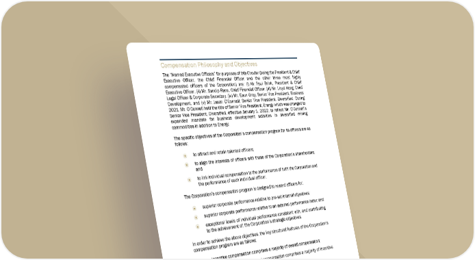 5 5 1 Compensation Philosophy and Objectives The “Named Executive Officers” for purposes of this Circular (being the President & Chief Executive Officer, the Chief Financial Officer and the other three most highly compensated officers of the Corporation) are: (i) Mr. Paul Brink, President & Chief Executive Officer, (ii) Mr. Sandip Rana, Chief Financial Officer, (iii) Mr. Lloyd Hong, Chief Legal Officer & Corporate Secretary, (iv) Mr. Eaun Gray, Senior Vice President, Business Development, and (v) Mr. Jason O’Connell, Senior Vice President, Diversified. During 2021, Mr. O’Connell held the title of Senior Vice President, Energy which was changed to Senior Vice President, Diversified, effectiv e January 1, 2022, to reflect Mr. O’Connell’s expanded mandate for business development activities in diversified mining commodities in addition to Energy. The specific objectives of the Corporation’s compensation program for its officers are as follows: t o attract and retain talented officers; t o align the interests of officers with those of the Corporation’s shareholders; and t o link individual compensation to the performance of both the Corporation and t he performance of each individual officer. The Corporation’s compensation program is designed to reward officers for: superior corporate performance relati ve to pre-set internal objectives; superior corporate performance relative to an external performance index; and exceptional levels of individual performance consistent with, and contributin g t o the achievement of, the Corporation’s strategic objectives. In order to achieve the above objectives, the key structural features of the Corporation’s compensation program are as follows: incentive compensation comprises a majority of overall compensation; long-term, at-risk share-based compensati on comprises a majority of incentive compensation; and t he value of long-term, at-risk share-based compensation is linked directly to t he medium and long-term growth of the Corporation’s share price. Performance benchmarks must be achi eved in order for performance-based share compensation to vest.