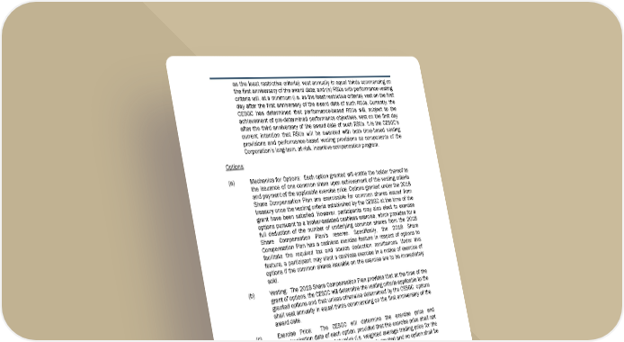 8 8 6 as the least restrictive criteria), vest annually in equal thirds commencing on the first anniversary of the award date; and (iv) RSUs with performance-vesting criteria will, at a minimum (i.e. as the least restrictive criteria), vest on the first day after the first anniversary of the award date of such RSUs. Currently, the CESGC has determined that performance-based RSUs will, subject to the achievement of pre-determined perform ance objectives, vest on the first day after the third anniversary of the award date of such RSUs. It is the CESGC’s current intention that RSUs will be awarded with both time-based vesting provisions and performance-based vestin g provisions as components of the Corporation’s long-term, at-risk, incentive compensation program. Options: (a) Mechanics for Options: Each option gran ted will entitle the holder thereof to the issuance of one common share upon achievement of the vesting criteria and payment of the applicable exercise price. Options granted under the 2018 Share Compensation Plan are exercisa ble for common shares issued from treasury once the vesting criteria establ ished by the CESGC at the time of the grant have been satisfied. However, pa rticipants may also elect to exercise options pursuant to a broker-assisted cashless exercise, which provides for a full deduction of the number of underlying common shares from the 2018 Share Compensation Plan’s reserv e. Specifically, the 2018 Share Compensation Plan has a cashless exerci se feature in respect of options to facilitate the required tax and source deduction remittances. Under this feature, a participant may elect a cashless exercise in a notice of exercise of options if the common shares issuable on the exercise are to be immediately sold. (b) Vesting: The 2018 Share Compensation Plan provides that at the time of the grant of options, the CESGC will determine the vesting criteria applicable to the granted options and that unless otherw ise determined by the CESGC, options shall vest annually in equal thirds commencing on the first anniversary of the award date. (c) Exercise Price: The CESGC will determine the exercise price and term/expiration date of each option, prov ided that the exercise price shall not be less than the fair market value (i.e. weighted average trading price for the last five trading days) on the date the option is granted and no option shall be exercisable after ten years from the date on which it is granted. Termination, Retirement and Other Cessation of Employment: A person participating in the 2018 Share Compensation Plan will cease to be eligible to participate in the following circumstances: (a) receipt of any notice of te rmination of employment or service (whether voluntary or involuntary and whether with or without cause); (b) retirement; and (c) any cessation of employment or service for any reason whatsoever, including disability and death (an “ E E v e n t o f T e r m i n a t i o n ”). In such circumstances, unless otherwise determined by the CESGC in its discretion, any unvested RSUs will be automatically forfeited and cancelled and any unvested options will be automatically cancelled, terminated and not available for exercise. Any vested options ma y be exercised only before the earlier of: (i) the termination of the option; and (ii) six months after the date of the Event of Termination. If a person is terminated for just cause, all unvested RSUs must be forfeited