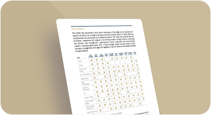 3 3 7 Skills Matrix The CESGC has developed a skills matrix comp rised of the skills and competencies it expects the Board as a whole to possess and has identified which of those skills and competencies are possessed by its existing directors. The skills and competencies are as follows: experience with respect to the mining industry, energy industry, accounting and finance, risk management, cybersecurity, human resources and compensation matters, corporate governance, ESG, climat e change, public company boards, public company management and legal and regulatory. Set out below are the skills identified for each director. S k i l l s D A V I D H H A R Q U A I L P A U L B R I N K T O M A L B A N E S E D E R E K E E V A N S C A T H A R I N E F A R R O W L O U I S G G I G N A C M A U R E E N J E N S E N J E N N I F E R M A K I R A N D A L L O L I P H A N T E L L I O T T P E W Mining Energy Accounting & Finance Risk Management Cybersecurity HR & Compensation Corporate Governance ESG Climate Change Public Company Boards Public Company Management Legal & Regulatory Director Retirement Policy/Term Limits The Board has adopted a director retirement policy which provides the framework for the Corporation to allow for the renewal of the Board, where appropriate, by specifying a process for the Board to determine whether tu rnover in the Board is appropriate. In 2019, the Board amended the director retirement policy to incorporate a term limit principle. The director retirement policy now provides that a director is required to submit his/her resignation to the Board on the March 1 st after such director’s (i) 72 nd birthday, or (ii) 10 th anniversary of Board service (where such director joined the Board after his or her 62 nd birthday) and on every March 1 st thereafter while such individual is still a director of the Corporation. The CESGC will consider such resignation and, taking into account factors such as the competencies and skills possessed by the Board as a whole and the director individually, the size of the Boar d, and the overall best interests of the Corporation, make a recommendation to the Board as to whether the Board should accept such resignation in conjunction with the Corporation’s next annual meeting of