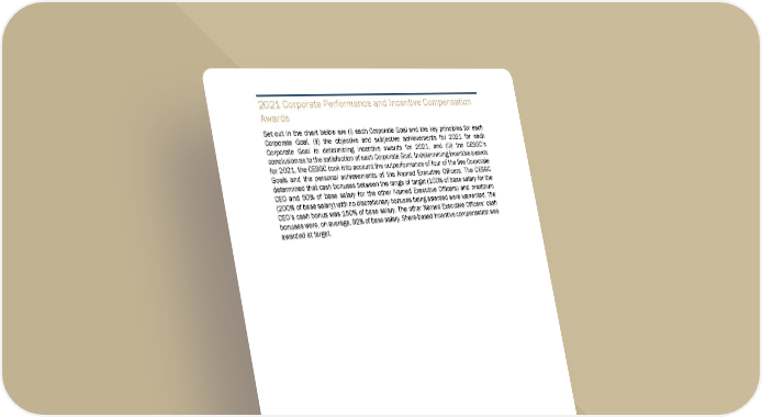 6 6 3 2021 Corporate Performance and Incentive Compensation Awards Set out in the chart below are (i) each Corp orate Goal and the key principles for each Corporate Goal, (ii) the objective and su bjective achievements for 2021 for each Corporate Goal in determining incentive awards for 2021, and (iii) the CESGC’s conclusion as to the satisfaction of each Corporate Goal. In determining incentive awards for 2021, the CESGC took into account the outperformance of four of the five Corporate Goals and the personal achievements of the Named Executive Officers. The CESGC determined that cash bonuses between the range of target (100% of base salary for the CEO and 50% of base salary for the othe r Named Executive Officers) and maximum (200% of base salary) with no discretionar y bonuses being awarded were warranted. The CEO’s cash bonus was 150% of base salary . The other Named Executive Officers’ cash bonuses were, on average, 92% of base salary. Share-based incentive compensation was awarded at target.