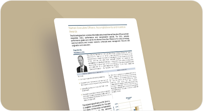 6 6 6 Named Executive Officers: Ac complishments and Incentive Awards The following section provides information ab out each Named Executive Officer and their respective 2021 performance and compensation awards. For 2021, personal performance goals were set for the Named Executive Officers in the areas of strategy, communications and investor relations, enhanced asset management, ESG and deal origination and execution. Paul Brink President & CEO Paul Brink is President & Chief Executive Officer of Franco-Nevada. Mr. Brink is responsible for, among other things: (i) providing leadership and direction to the Franco-Nevada management team; (ii) fostering a corporate culture that promotes ethical practices and encourages individual integrity; (iii) developing and recommending to the Board a long-term strategy and vision; and (iv) having overall responsibility for the achievement of Franco-Nevada’s financial and operating goals and objectives. For a brief biographical description for Mr. Brink, please see “Director Information – Nominee Information” above. Individual performance considerations CESGC conclusions Mr. Brink: Continued to provide outstanding leadership Successfully led the review and communication of the Corporation’s evolving commodity mix strategy Guided the application of over US$700M in new investments Successfully provided a diverse, inclusive and safe workplace including overseeing flexible work from home arrangements and safe, flexible return to the office arrangements Mr. Brink met or exceeded all objectives set for him in 2021. In light of Mr. Brink’s individual outperformance and the results of the Corporate Goals performance, Mr. Brink was awarded an above-target (but below maximum) cash bonus and other incentive compensation at targeted levels, all as detailed in the Summary Compensation Table. For 2022, Mr. Brink’s base salary was adjusted to C$900,000 in recognition of his progression in the role of CEO and to align with industry practice. The adjacent graph sets out Mr. Brink’s: (i) targeted compensation for the past two years, (ii) the actual compensation awarded (based on the amounts reported in the Summary Compensation Tables in the Corporation’s management information circulars for the relevant years), (iii) the compensation realized based on the market value of vested time-based and performance-based RSUs as at the date of vesting, and (iv) the amounts which may be realized in the future in respect of each relevant year (based on the market value of unvested time-based and performance- based RSUs (based on original grant numbers) as at December 31, 2021).