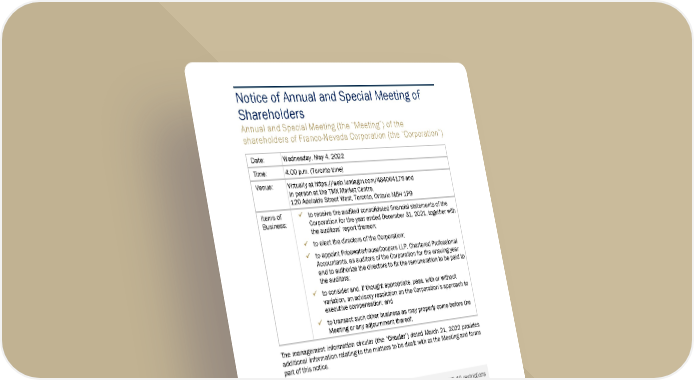 Notice of Annual and Special Meeting of Shareholders Annual and Special Meeting (the “Meeting”) of the shareholders of Franco-Nevada Corporation (the “Corporation”) Date: Wednesday, May 4, 2022 Time: 4:00 p.m. (Toronto time) Venue: Virtually at http s://web.lumiagm.com/484064175 and in person at the TMX Market Centre, 120 Adelaide Street West, Toronto, Ontario M5H 1P9 Items of Business: 9 9 t o receive the audited consolidated financial statements of the Corporation for the year ended December 31, 2021, together with t he auditors’ report thereon; 9 9 t o elect the directors of the Corporation; 9 9 t o appoint PricewaterhouseCooper s LLP, Chartered Professional Accountants, as auditors of the Corporation for the ensuing year and to authorize the directors to fix the remuneration to be paid to t he auditors; 9 9 t o consider and, if thought appr opriate, pass, with or without variation, an advisory resolution on the Corporation’s approach to executive compensation; and 9 9 t o transact such other business as may properly come before the Meeting or any adjournment thereof. The management information circular (the “C C i r c u l a r ”) dated March 21, 2022 provides additional information relating to the matters to be dealt with at the Meeting and forms part of this notice. Hybrid Meeting The Corporation plans on holding a hybrid meeting this year as COVID-19 restrictions have been lifted. The online meeting will be via live webcast at https://web.lumiagm.com/484064 175 and in person at the TMX Market Centre, 120 Adelaide Street West, Toronto, Ontario M5H 1P9. Registered shareholders and their duly appointed proxyholders can attend, su bmit questions and vote at the Meeting. Non-registered or beneficial shareholders must appoint themselves (or someone to attend on their behalf) as proxyholder in order to be able to vote at the Meeting. Otherwise, such non-registered or beneficial shareholders will only be able to attend as a guest. Detailed instructions on how to participate in the Meeting (either virtually or in person) are provided in the attached Circular. It is possible that changes to the date, time or location/format of the Meeting may be required as a result of COVID-19. We will announce any changes or updates in respect of our Meeting on our website or by press release.