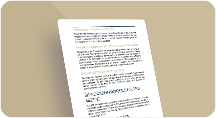 8 8 9 Indebtedness of Directors and Officers During the most recently completed financial year and as at the date hereof, no director, proposed nominee for election as a director, officer, employ ee or associate of any such persons has been or is indebted to the Co rporation nor has the Corporation guaranteed any loans on behalf of any of these individuals. Interest of Management and Others in Material Transactions Management of the Corporation is not aware of a material interest, direct or indirect, of any director or officer of the Corporation, any director or officer of a body corporate that is itself an insider or subsidiary of the Corporation, any proposed nominee for election as a director of the Corporation, any principal shareholder, or any associate or affiliate of any such person, in any transaction since the commencement of the Corporation’s most recently completed financial year or in any proposed transaction which has materially affected or would materially affect the Corporation or any of its subsidiaries. Directors and Officers Liability Insurance The Corporation maintains directors’ and officers’ liability insurance for the officers and directors of the Corporation which provides co verage in the amount of US$80 million in each policy year. The deductible amount on the policy is US$5 million and the total annual premium for the policy for 2022 is US$0.8 million, which excludes any commissions paid to brokers. SHAREHOLDER PROPOSALS FOR NEXT MEETING The CBCA, which governs the Corporation, sets out detailed requirements to be complied with for shareholder proposals and provides th at they must be received by December 21, 2022 to be considered for inclusion in the management information circular and the form of proxy for the 2023 annual meeting of shar eholders, which is expected to be held on or about May 2, 2023. ADDITIONAL INFORMATION Additional information relating to the Corporation is available on SEDAR at www.sedar.com, on EDGAR at www.sec.gov and on the Corporation’s website at www.franco-nevada.com. Financial information is provided in the Corporation’s audited annual financial statements and management’s discussion and analysis as at and for the year ended December 31, 2021. In addition, copies of the Corporation’s audited annual financial statements and management’s discussion and analysis as at and for the year ended December 31, 2021 may be obtained upon request to the Corp orate Secretary of the Corporation. The Corporation may require the payment of a reason able charge if the request is made by a person who is not a shareholder of the Corporation.