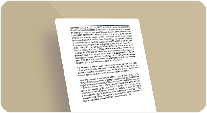 7 7 5 December 11, 2020). In 2020, the CESGC eliminated the grant of stock options to Named Executive Officers as part of the annual compensation program and increased the target grants for performance-based RSUs such that more than 50% of share-based compensation was subject to performance- based vesting criteria. During 2020, an aggregate of 31,284 RSUs were awarded to the Named Executive Officers, being 19,289 performance-based RSUs which will vest on December 11, 2023 upon the satisfaction of certain performance criteria and 11,995 time-based RSUs which will vest annually in equal thirds commencing on the first annivers ary of the award date (being December 11, 2021). During 2021, an aggregate of 45,931 RSUs were awarded to the Named Executive Officers, as follows: (i) 20,380 pe rformance-based RSUs which will vest on December 11, 2024 upon the satisfaction of certain performance criteria, (ii) 12,631 time-based RSUs which will vest annually in equal thirds commencing on the first anniversary of the award date (being December 11, 2022), and (iii) 12,920 performance- based RSUs, which vested immediately, base d on the application of the performance- based multiplier to the performance-based RSUs granted in 2018. The only awards of options reported in th e Summary Compensation Table above are as follows: an award of stock options to the Na med Executive Officers in 2019 as part of the annual incentive compensation progra m (an aggregate of 52,917 options were awarded at an exercise price of C$129.32 , vesting over a three-year period). There were no awards of stock options to Named Executive Officers in 2021 as the practice of granting stock options to management as part of the annual compensation program was discontinued starting in 2020. St ock options are granted from time to time in connection with new hires or internal promotions. During 2021, a total of 81,698 options were granted by the Corporation in connection with new hires, internal promotions and one-time grants to junior staf f and the total option grant rate in 2021 as a percentage of the number of common shares outstanding as at December 31, 2021 was approximately 0.04%. The total cost of Named Executive Officer compensation in 2021 as a percentage of Adjusted EBITDA (1) was approximately 1.0%. Note (1) Please refer to Schedule “B” Non-GAAP Financial Measures.