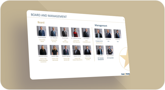 30 BOARD AND MANAGEMENT David Harquail Chair of the Board Tom Albanese Former CEO Rio Tinto Derek Evans CEO MEG Energy Louis Gignac Chair G Mining Ventures Maureen Jensen Former CEO Ontario Securities Commission Jennifer Maki Former CEO Vale Canada Randall Oliphant Former CEO Barrick Gold Jacques Perron Former CEO Pretium Resources Inc Board Dr. Catharine Farrow Former CEO TMAC Resources Elliott Pew Former Chair EnerPlus Paul Brink President & CEO Board Director Sandip Rana CFO Lloyd Hong CLO Jason O’Connell SVP, Diversified Eaun Gray SVP, Business Development Management