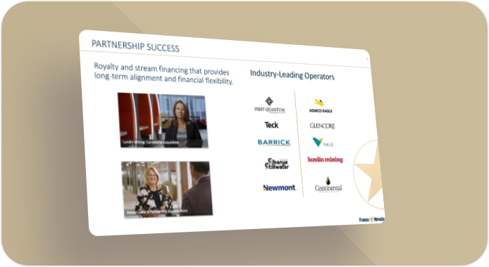 5 PARTNERSHIP SUCCESS Royalty and stream financing that provides long-term alignment and financial flexibility. Industry-Leading Operators Lundin Mining: Candelaria Acquisition Detour Lake: A Partnership Success Story Franco-Nevada Corporate Presentation Page 4 Page 6Video Player is loading.Play VideoPlaySkip BackwardSkip ForwardMuteCurrent Time 0:00/Duration 3:56Loaded: 0.00%0:02Stream Type LIVESeek to live, currently behind liveLIVERemaining Time -3:54 1xPlayback RateChaptersChaptersDescriptionsdescriptions off, selectedCaptionscaptions settings, opens captions settings dialogcaptions off, selectedAudio TrackPicture-in-PictureFullscreenThis is a modal window.Beginning of dialog window. Escape will cancel and close the window.TextColorWhiteBlackRedGreenBlueYellowMagentaCyanOpacityOpaqueSemi-TransparentText BackgroundColorBlackWhiteRedGreenBlueYellowMagentaCyanOpacityOpaqueSemi-TransparentTransparentCaption Area BackgroundColorBlackWhiteRedGreenBlueYellowMagentaCyanOpacityTransparentSemi-TransparentOpaqueFont Size50%75%100%125%150%175%200%300%400%Text Edge StyleNoneRaisedDepressedUniformDrop shadowFont FamilyProportional Sans-SerifMonospace Sans-SerifProportional SerifMonospace SerifCasualScriptSmall CapsResetDoneClose Modal DialogEnd of dialog window.Video Player is loading.Play VideoPlaySkip BackwardSkip ForwardMuteCurrent Time 0:00/Duration 6:12Loaded: 0.00%0:01Stream Type LIVESeek to live, currently behind liveLIVERemaining Time -6:11 1xPlayback RateChaptersChaptersDescriptionsdescriptions off, selectedCaptionscaptions settings, opens captions settings dialogcaptions off, selectedAudio TrackPicture-in-PictureFullscreenThis is a modal window.Beginning of dialog window. Escape will cancel and close the window.TextColorWhiteBlackRedGreenBlueYellowMagentaCyanOpacityOpaqueSemi-TransparentText BackgroundColorBlackWhiteRedGreenBlueYellowMagentaCyanOpacityOpaqueSemi-TransparentTransparentCaption Area BackgroundColorBlackWhiteRedGreenBlueYellowMagentaCyanOpacityTransparentSemi-TransparentOpaqueFont Size50%75%100%125%150%175%200%300%400%Text Edge StyleNoneRaisedDepressedUniformDrop shadowFont FamilyProportional Sans-SerifMonospace Sans-SerifProportional SerifMonospace SerifCasualScriptSmall CapsResetDoneClose Modal DialogEnd of dialog window.Opens FullscreenOpens FullscreenOpens FullscreenOpens FullscreenOpens FullscreenOpens FullscreenOpens FullscreenOpens FullscreenOpens Fullscreenclr.com