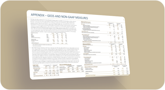 32 (expressed in millions, except per share amounts) For the three months ended December 31, For the year ended December 31, 2022 2021 2022 2021 Adjusted Net Income $ 164.9 163.7 $ 697.6 673.6 Revenue 320.4 327.7 1,315.7 1,300.0 Adjusted Net Income Margin 51.5% 50.0% 53.0% 51.8% APPENDIX GEOS AND NON - GAAP MEASURES 1. Starting in Q4 2021, revenue from Franco - Nevadas Energy assets is included in the calculation of GEOs. GEOs for comparative periods have been recalculated to conform with the current presentation. GEOs include Franco - Nevadas attributable share of production from our Mining and Energy assets, after applicable recovery and payability factors. GEOs are estimated on a gross basis for NSR royalties and, in the case of stream ounces, before the payment of the per ounce contractual price paid by the Company. For NPI royalties, GEOs are calculated taking into account the NPI economics. Silver, platinum, palladium, iron ore, oil, gas and other commodities are converted to GEOs by dividing associated revenue, which includes settlement adjustments, by the relevant gold price. The price used in the computation of GEOs earned from a particular asset varies depending on the royalty or stream agreement, which may make reference to the market price realized by the operator, or the average price for the month, quarter, or year in which the commodity was produced or sold. 2. Non - GAAP financial measures: Cash Costs, Cash Costs per GEO sold, Adjusted Net Income, Adjusted Net Income per Share, Adjusted Net Income Margin, Adjusted EBITDA, Adjusted EBITDA per share, and Adjusted EBITDA Margin are non - GAAP financial measures with no standardized meaning under IFRS and might not be comparable to similar financial measures disclosed by other issuers. For a quantitative reconciliation of each non - GAAP financial measure to the most directly comparable IFRS financial measure, refer to the following tables. Further information relating to these Non - GAAP financial measures is incorporated by reference from the Non - GAAP Financial Measures section of Franco - Nevadas MD&A for the three and nine months ended December 31, 2022 and filed on March 15, 2023 with the Canadian securities regulatory authorities on SEDAR available at www.sedar.com and with the U.S. Securities and Exchange Commission available on EDGAR at www.sec.gov. Starting in Q4 2021, revenue from Franco - Nevadas Energy assets are included in the calculation of GEOs. Similarly, the composition of Cash Costs and Cash Costs per GEO sold has been amended to include costs and GEOs related to Franco - Nevadas Energy assets. Cash Costs and Cash Costs per GEO sold for comparative periods have been recalculated to conform with current presentation.