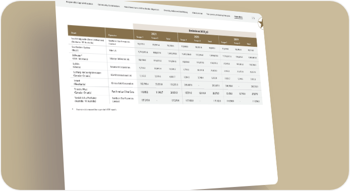 5 6 Appendices Transparency & Guiding Principles Climate Action Diversity, Inclusion & Well-Being Good Governance & Shareholder Alignment Community Contributions Responsible Capital Allocation Emissions (tCO 2 e) 2021 2020 2019 Asset Operator Scope 1 Scope 2 Total Scope 1 Scope 2 Total Scope 1 Scope 2 Total South Kalgoorlie (New Celebration) (Australia - W. Australia) Northern Star Resources Limited 10,373.1 13,935.4 24,308.6 12,980.0 20,022.0 33,002.0 11,659.0 18,494.0 30,153.0 Southestern System (Brazil) Vale S.A. 1,732,322.6 100,027.9 1,832,350.6 1,442,456.0 117,214.0 1,559,670.0 1,714,017.4 126,676.5 1,840,693.9 Stillwater* (USA - Montana) Sibanye-Stillwater Ltd. 38,433.0 116,351.0 154,784.0 63,303.0 110,272.0 173,575.0 37,345.0 101,385.0 138,730.0 Subika (Ghana) Newmont Corporation 4,739.3 13,845.4 18,584.7 3,739.0 18,134.0 21,873.0 3,455.0 21,872.0 25,327.0 Sudbury-McCreedy West Mine (Canada - Ontario) KGHM International Ltd. 1,162.2 3,019.6 4,181.7 1,284.5 3,748.4 5,032.9 1,926.7 5,549.6 7,476.3 Tasiast (Mauritania) Kinross Gold Corporation 102,701.4 53,551.8 156,253.3 295,687.0 - 295,687.0 298,392.0 - 298,392.0 Timmins West (Canada - Ontario) Pan American Silver Corp. 14,865.2 11,966.7 26,831.9 15,754.0 12,616.0 28,370.0 13,488.0 13,749.0 27,237.0 Yandal (Julius/Red Lake) (Australia - W. Australia) Northern Star Resources Limited 137,249.6 - 137,249.6 117,103.0 - 117,103.0 114,596.0 - 114,596.0 * Emission data sourced from operator’s CDP reports.