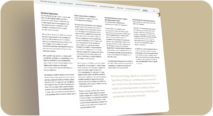 6 8 Appendices Transparency & Guiding Principles Climate Action Diversity, Inclusion & Well-Being Good Governance & Shareholder Alignment Community Contributions Responsible Capital Allocation Carbon Sequestration at Weyburn (Franco-Nevada has royalty interests and a working interest at Weyburn) Whitecap Resources’ Weyburn Unit in southeast Saskatchewan is a CO 2 injection enhanced oil recovery project. CO 2 is transported as a liquid from two separate industrial sources. At the source, the CO 2 is captured and compressed before transmission via pipeline to Weyburn. The CO 2 in liquid form is then injected at high pressure into the Weyburn Unit. The gas stream that is recovered with the oil production is processed for natural gas liquids and the remaining CO 2 volume is reinjected into the formation on an ongoing basis. Accordingly, with minor adjustment for losses, all of the CO 2 purchased and transported by pipeline for injection at Weyburn constitutes additional CO 2 volumes stored each year. Since its inception in 2000, more than 36 million tonnes of CO 2 , or an average of 1.7 million tonnes of CO 2 per annum, from two separate industrial sources have been captured and stored 1.5 km underground, the equivalent of taking approximately 8 million cars off the road for an entire year. In addition to having carbon storage benefits, injecting CO 2 helps oil come to the surface more easily and improves the efficiency of production, maximizing the ultimate recovery of oil originally in place. Mining and energy operators utilizing lower emission and emissions reduction processes and technologies demonstrate their adaptability to climate change. As decarbonisation continues to take centre stage, we will continue to look to partner with and fund these companies and projects, which involvement will improve our own sustainability profile. Continental Resources Carbon Capture and Sequestration Project (Franco-Nevada has a strategic royalty acquisition joint venture with Continental) In March 2022, Continental Resources announced that it would be investing $250 million over the next two years to help Summit Carbon Solutions build a $4.5 billion carbon capture and sequestration project. It is anticipated that the project will capture and transport via pipeline 8 million metric tonnes per year of CO 2 from 31 ethanol plants across the US Midwest. That carbon will then be sequestered in subsurface geologic formations in North Dakota, where Continental Resources will leverage its geologic expertise gained from its extensive oil and gas drilling operations in the Bakken Shale. The project aims to bring operations online the first half of 2024 and will have the capability of expanding to ultimately transport up to 20 million metric tonnes per year of CO 2 . Mt. Keith Solar Farm and Carbon Capture (Franco-Nevada has royalty interests on the Mt. Keith nickel operation) In July 2021, BHP announced its plans to build a 27.4 MW solar farm at its Mt. Keith nickel operations, BHP’s first off-grid large-scale renewable energy project across its global operations, which will replace power currently supplied by diesel and gas. The solar farm, where construction is currently underway, will significantly reduce BHP’s Scope 2 emissions at Mt. Keith. In October 2021, BHP also announced plans to conduct trials at the Mt. Keith tailings dam at Nickel West, which could store about 40,000 tonnes of CO 2 from the atmosphere per year. BHP’s initial research has indicated that enhancing the mineral carbonation rate of the tailings dam could significantly increase its capacity to store CO 2 . Resilient Operators Our investments in organizations, projects and initiatives developing adaptive capacity to respond to climate change to better manage climate-related risks and seize opportunities may improve our own reputation, market valuation and resilience to the transition to a low-carbon economy. Many of the assets in our portfolio are operated by best-in-class operators. The ingenuity and technical skills of these operators, including relating to sustainable practices, processes and technologies, often provide them with a competitive advantage, reducing their costs and their operating risks and ultimately reducing their cost of capital. Mining and energy operators, including all of our Top Mining Producers, contributing to more than two-thirds of our 2022 revenues have proactively set targets and developed plans to reduce carbon emissions, with some committing to the long-term achievement of net-zero emissions. We continue to look for opportunities to invest in other best-in-class operators and, as a capital provider, potentially facilitate their low-carbon transitions. On this page, we have highlighted the resourcefulness of certain of our operators, their efforts to reduce their carbon footprints, and their commitments to combating climate change, which exemplify the types of operators and operations where we look to deploy capital. “Mining and energy operators, including all of our Top Mining Producers, contributing to more than two-thirds of our 2022 revenues have proactively set targets and developed plans to reduce carbon emissions, with some committing to the long-term achievement of net-zero emissions.”