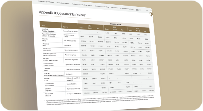5 3 Appendices Transparency & Guiding Principles Climate Action Diversity, Inclusion & Well-Being Good Governance & Shareholder Alignment Community Contributions Responsible Capital Allocation Appendix B: Operators’ Emissions * Emissions (tCO 2 e) 2021 2020 2019 Asset Operator Scope 1 Scope 2 Total Scope 1 Scope 2 Total Scope 1 Scope 2 Total Agate Creek (Australia - Queensland) Laneway Resources Limited - - - 3,442.0 7,146.0 10,588.0 612.0 1,357.0 1,969.0 Agnew (Vivien Gold Mine) (Australia - W. Australia) Remelius Resources Limited 9,614.8 8,351.7 17,966.6 7,440.0 6,701.0 14,141.0 8,623.0 7,599.0 16,222.0 Antamina (Peru) Teck Resources Limited 564,073.6 230,270.1 794,343.8 381,951.4 166,304.3 548,255.7 442,276.2 172,630.8 614,907.0 Antapaccay (Peru) Glencore plc 302,057.5 141,100.4 443,157.9 297,744.4 166,004.3 463,748.7 306,001.9 215,354.7 521,356.6 Bald Mountain (USA - Nevada) Kinross Gold Corporation 125,910.3 24,975.4 150,885.7 121,554.0 44,495.0 166,049.0 112,988.0 52,891.0 165,879.0 Bowen Basin (Moorvale) (Australia - Queensland) Peabody Energy Corp 150,245.9 14,662.1 164,908.0 139,211.0 14,443.0 153,654.0 163,782.0 25,498.0 189,280.0 Brucejack (Canada - British Columbia) Newcrest Mining Limited 30,363.4 1,222.3 31,585.7 20,676.0 1,291.0 21,967.0 20,608.0 1,366.0 21,974.0 Canadian Malartic (Canada - Quebec) Agnico Eagle Mines Limited 210,395.2 791.6 211,186.8 218,268.0 847.0 219,115.0 227,041.0 1,482.0 228,523.0 Candelaria (Chile) Lundin Mining Corporation 341,568.9 342,965.9 684,534.8 279,650.2 279,610.2 559,260.4 323,346.0 335,372.2 658,718.2 Carol Lake (Canada - Newfoundland & Labrador) Rio Tinto plc 393,318.5 - 393,318.5 394,058.6 - 394,058.6 407,055.8 - 407,055.8 Caserones (Chile) JX Nippon Mining & Metals Corporation 307,225.1 285,867.7 593,092.7 - - - - - - Castle Mountain (USA - California) Equinox Gold Corp. 7,156.6 2,661.4 9,818.0 957.0 416.0 1,373.0 - - - Cerro Moro (Argentina) Pan American Silver Corp. 42,625.2 - 42,625.2 41,500.0 - 41,500.0 49,894.0 - 49,894.0 Cobre Panama (Panama) First Quantum Minerals Ltd. 2,512,552.2 270,145.9 2,782,698.2 2,187,011.0 73,279.2 2,260,290.2 1,991,271.0 149,383.8 2,140,654.8 * Figures in this table are estimated greenhouse gas emissions of producing mining assets where we have royalty and stream interests. Unless otherwise noted, such information has been provided by McKinsey MineSpans (outside-in modeled data - all rights reserved). Such data only relates to mine production and excludes emissions attributable to mine construction, pre-stripping, underground development relating to non-operational activities, care and maintenance of assets, and mine rehabilitation. Emission data (i) is provided on a 100% basis, notwithstanding that the applicable operation may be jointly owned by the referenced operator and (ii) applies to the entire project. “NA” means that data is not publicly available and has not been modeled by McKinsey MineSpans.