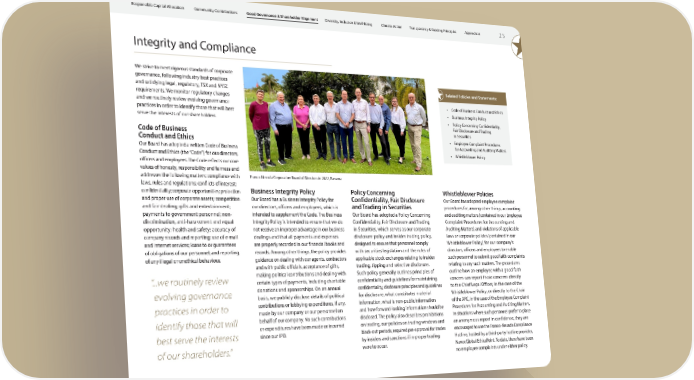 2 5 Appendices Transparency & Guiding Principles Climate Action Diversity, Inclusion & Well-Being Good Governance & Shareholder Alignment Community Contributions Responsible Capital Allocation Integrity and Compliance Business Integrity Policy Our Board has a Business Integrity Policy for our directors, officers and employees, which is intended to supplement the Code. The Business Integrity Policy is intended to ensure that we do not receive an improper advantage in our business dealings and that all payments and expenses are properly recorded in our financial books and records. Among other things, the policy provides guidance on dealing with our agents, contractors and with public officials, acceptance of gifts, making political contributions and dealing with certain types of payments, including charitable donations and sponsorships. On an annual basis, we publicly disclose details of political contributions or lobbying expenditures, if any, made by our company or our personnel on behalf of our company. No such contributions or expenditures have been made or incurred since our IPO. Policy Concerning Confidentiality, Fair Disclosure and Trading in Securities Our Board has adopted a Policy Concerning Confidentiality, Fair Disclosure and Trading in Securities, which serves as our corporate disclosure policy and insider trading policy, designed to ensure that personnel comply with securities legislation and the rules of applicable stock exchanges relating to insider trading, tipping and selective disclosure. Such policy generally outlines principles of confidentiality and guidelines for maintaining confidentiality, disclosure principles and guidelines for disclosure, what constitutes material information, what is non-public information and how forward-looking information should be disclosed. The policy also describes prohibitions on trading, our policies on trading windows and black-out periods, required pre-approval for trades by insiders and sanctions if improper trading were to occur. Whistleblower Policies Our Board has adopted employee complaint procedures for, among other things, accounting and auditing matters (contained in our Employee Complaint Procedures for Accounting and Auditing Matters) and violations of applicable laws or corporate policies (contained in our Whistleblower Policy) for our company’s directors, officers and employees to enable such personnel to submit good faith complaints relating to any such matters. The procedures outline how an employee with a good faith concern can report those concerns directly to the Chief Legal Officer, in the case of the Whistleblower Policy, or directly to the Chair of the ARC, in the case of the Employee Complaint Procedures for Accounting and Auditing Matters. In situations where such personnel prefer to place an anonymous report in confidence, they are encouraged to use the Franco-Nevada Compliance Hotline, hosted by a third-party hotline provider, Navex Global EthicsPoint. To date, there have been no employee complaints under either policy. We strive to meet rigorous standards of corporate governance, following industry best practices and satisfying legal, regulatory, TSX and NYSE requirements. We monitor regulatory changes and we routinely review evolving governance practices in order to identify those that will best serve the interests of our shareholders. Code of Business Conduct and Ethics Our Board has adopted a written Code of Business Conduct and Ethics (the “Code”) for our directors, officers and employees. The Code reflects our core values of honesty, responsibility and fairness and addresses the following matters: compliance with laws, rules and regulations; conflicts of interest; confidentiality; corporate opportunities; protection and proper use of corporate assets; competition and fair dealing; gifts and entertainment; payments to government personnel; non- discrimination, anti-harassment and equal opportunity; health and safety; accuracy of company records and reporting; use of e-mail and internet services; loans to or guarantees of obligations of our personnel; and reporting of any illegal or unethical behaviour. Franco-Nevada Corporation Board of Directors in 2022, Panama “...we routinely review evolving governance practices in order to identify those that will best serve the interests of our shareholders.” • Code of Business Conduct and Ethics • Business Integrity Policy • Policy Concerning Confidentiality, Fair Disclosure and Trading in Securities • Employee Complaint Procedures for Accounting and Auditing Matters • Whistleblower Policy Related Policies and Statements: