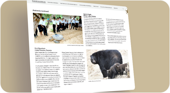 1 5 Appendices Transparency & Guiding Principles Climate Action Diversity, Inclusion & Well-Being Good Governance & Shareholder Alignment Community Contributions Responsible Capital Allocation Agnico Eagle: Detour Lake, Ontario The Detour Lake mine continues to expand its progressive reclamation program to include new areas of focus and research. In addition to the ongoing native plant revegetation research, tailings and test cover programs, and lichen and soil biological crust restoration projects, the team has included studies using mycorrhizal fungi to help improve tree seedling survival, as well as an expansion of the lichen transplant trials from greenhouse scale up to a field transplant trial. Efforts also continue to support the preservation of the Woodland Caribou by means of ongoing aerial surveys and telemetry collaring programs, and direct habitat restoration. The West Detour Project expansion is currently being planned to make sure Woodland Caribou’s calving areas are considered. Each year, with the help of trained ecologists, the Detour Lake mine conducts a seed collection program to harvest and process native seeds for most deciduous species on the mine site. These seeds are then added to a “seed bank” which is pulled from every year to plant and sprout saplings in a greenhouse before shipping them to site to plant as part of the site’s progressive reclamation program. The operation progressively reclaims completed rock storage facility areas, including earthworks and revegetation. The mine has also developed a 3D immersive virtual model to help visualize what the site will look like at closure. Wildlife at Detour Lake Mine, Ontario Sea Turtle Conservancy turtle release, Panama First Quantum: Cobre Panama, Panama Cobre Panama lies within the Mesoamerican Biological Corridor of the Panama Atlantic (“MBCPA”) and the Golfo de los Misquitos Forests Important Bird Area. The region supports very high biodiversity and is also home to the Santa Fe and Omar Torrijos National Parks. First Quantum, through its subsidiary Minera Panama, S.A. (“Minera Panama”), has committed to support three protected areas in the MBCPA. Following the creation of the Cobre Panama Foundation in 2019, Minera Panama and the Ministry for the Environment have now signed a long-term agreement to continue to support the protected areas around MBCPA. The areas are the Santa Fe National Park (72,636 hectares), Omar Torrijos National Park (25,275 hectares) and a protected area to be established in the District of Donoso and its coastal marine zone (more than 150,000 hectares). Minera Panama has committed to reforestation of 10,475 hectares (7,375 hectares outside the mine footprint and 3,100 hectares within the mine footprint). The company has also committed to implementing a number of species level management plans. These have been developed with the aim of addressing the management needs of individual species for which the protected areas and reforestation plans may not be sufficient. Each species action plan describes a portfolio of actions aimed at ensuring a net positive impact on species viability. Minera Panama is currently partnered with the Smithsonian Tropical Research Institute of Tropical Investigations (amphibian rescue), the Sea Turtle Conservancy (sea turtles), the Peregrine Fund (Harpy Eagles), Missouri Botanical Gardens (plant life), and Yaguara (jaguars). Biodiversity (continued)