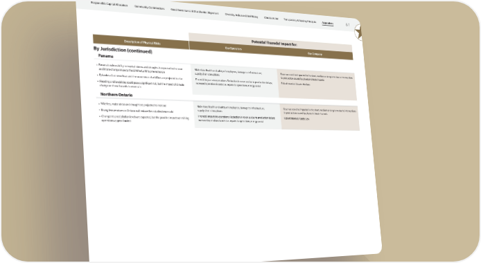 6 1 Appendices Transparency & Guiding Principles Climate Action Diversity, Inclusion & Well-Being Good Governance & Shareholder Alignment Community Contributions Responsible Capital Allocation Potential Financial Impact for: Description of Physical Risks Our Operators Our Company By Jurisdiction (continued) Panama • Panama’s vulnerability to tropical storms and droughts is expected to increase as climate change impacts the El Niño/La Niña phenomenon • Episodes of extreme heat and the occurrence of wildfires are projected to rise • Flooding and landslides could pose a significant risk, but the impact of climate change on these hazards is uncertain Main risks: Health and safety of employees, damage to infrastructure; supply chain disruptions Financial impacts to operations: Reduction in revenue due to production delays; increased operational costs (i.e. repairs to operations, energy costs) Revenue could be impacted in the short, medium or long-term due to interruptions to production caused by physical climate hazards Risk of stranded Assets: Medium Northern Ontario • Wildfires, water stress and drought are projected to increase • Rising temperatures in Ontario will reduce the risk of extreme cold • Changes to precipitation levels are expected, but the possible impacts on mining operations appear limited Main risks: Health and safety of employees; damage to infrastructure; supply chain disruptions Financial impacts to operations: Reduction in revenue due to production delays; increased operational costs (i.e. repairs to operations, energy costs) Revenue could be impacted in the short, medium or long-term due to interruptions to production caused by physical climate hazards Risk of stranded Assets: Low