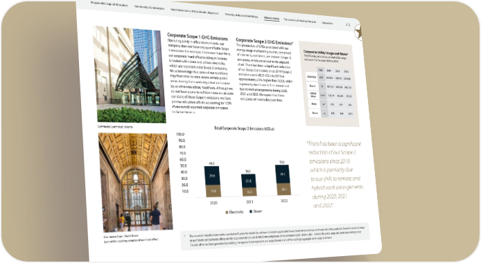 4 0 Appendices Transparency & Guiding Principles Climate Action Diversity, Inclusion & Well-Being Good Governance & Shareholder Alignment Community Contributions Responsible Capital Allocation Corporate Scope 1 GHG Emissions Operating solely in office environments, our company does not have any quantifiable Scope 1 emissions. For example, Commerce Court West, our corporate head office building in Toronto, is heated with steam and utilizes electricity, which are reported under Scope 2 emissions. We acknowledge that some of our workforce may from time-to-time access certain public areas during their work days that are heated by, or otherwise utilize, fossil fuels. Although we do not have access to sufficient data to calculate our share of these Scope 1 emissions, we have purchased carbon offsets accounting for 125% of our overall reported corporate emissions to factor these in. Corporate Scope 2 GHG Emissions* The production of GHGs associated with our energy usage and heating sources, comprised of electricity and steam, are indirect (Scope 2) emissions, which are set out in the adjacent chart. There has been a significant reduction of our Scope 2 emissions since 2019 (Scope 2 emissions were 62.0 tCO 2 e in 2019 or approximately 23% higher than 2022), which is primarily due to our shift to remote and hybrid work arrangements during 2020, 2021 and 2022. We expect that these emissions will normalize over time. 19.4 14.2 20.3 29.6 21.8 30.1 49.0 36.0 50.4 - 10.0 20.0 30.0 40.0 50.0 60.0 70.0 80.0 90.0 100.0 2020 2021 2022 Electricity Steam 8.8 8.7 28.9 11.5 37.7 20.2 - 10.0 20.0 30.0 40.0 50.0 60.0 70.0 80.0 90.0 100.0 2020 2021 Employee Commuting - Car 6.0 7.0 0.1 14.1 14.0 16.0 * Due to certain logistical constraints, reported utility data for electricity and steam (including applicable Scope 2 emissions) and water and waste (including applicable Scope 3 emissions) relates to our Toronto and Barbados offices and for 2022 covers 87.5% (35 of 40 full-time employees) of our company (2020 - 88.6%; 2021 – 88.9%). The water usage and waste data relating to our Toronto office has been generated by building management and represents our proportionate share of the building’s aggregate water usage and waste. Corporate Utility Usage and Waste* The following sets out our annual utility usage and waste for the years 2020 to 2022. Unit 2020 2021 2022 Electricity kWh 204,016 190,545 213,596 Steam lb 467,412 305,306 393,124 Chilled Water ton-h 31,119 33,448 27,513 Water m 3 478 371 450 Waste kg 850 833 1,511 “There has been a significant reduction of our Scope 2 emissions since 2019, which is primarily due to our shift to remote and hybrid work arrangements during 2020, 2021 and 2022.” Commerce Court West, Toronto Commerce Court, North Tower (part of the building complex of our head office) Total Corporate Scope 2 Emissions (tCO 2 e)